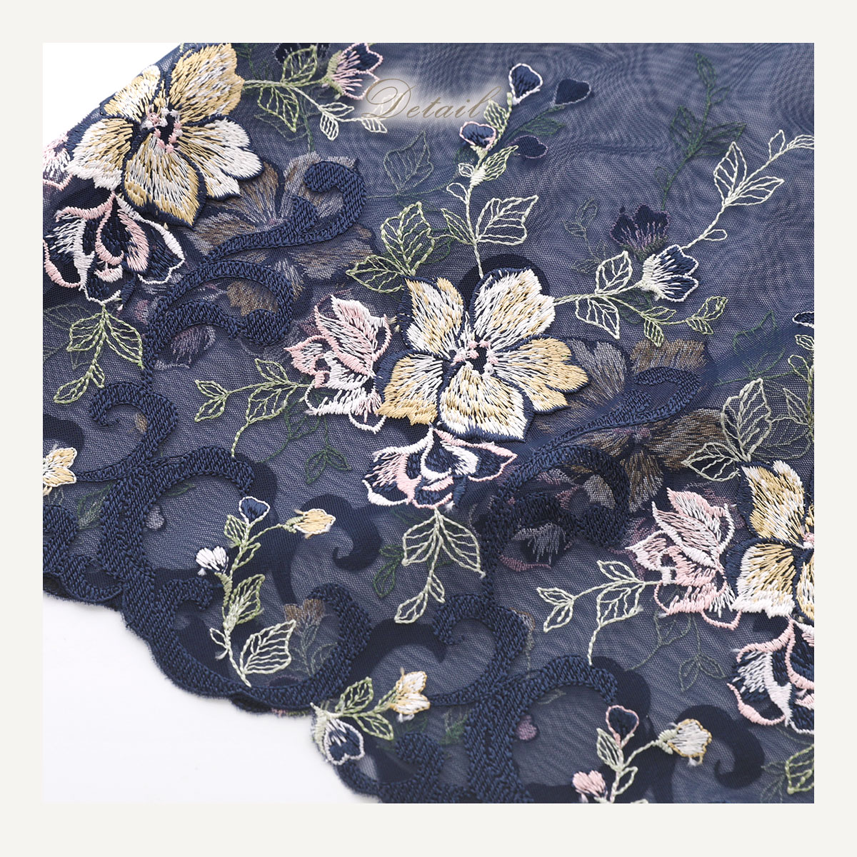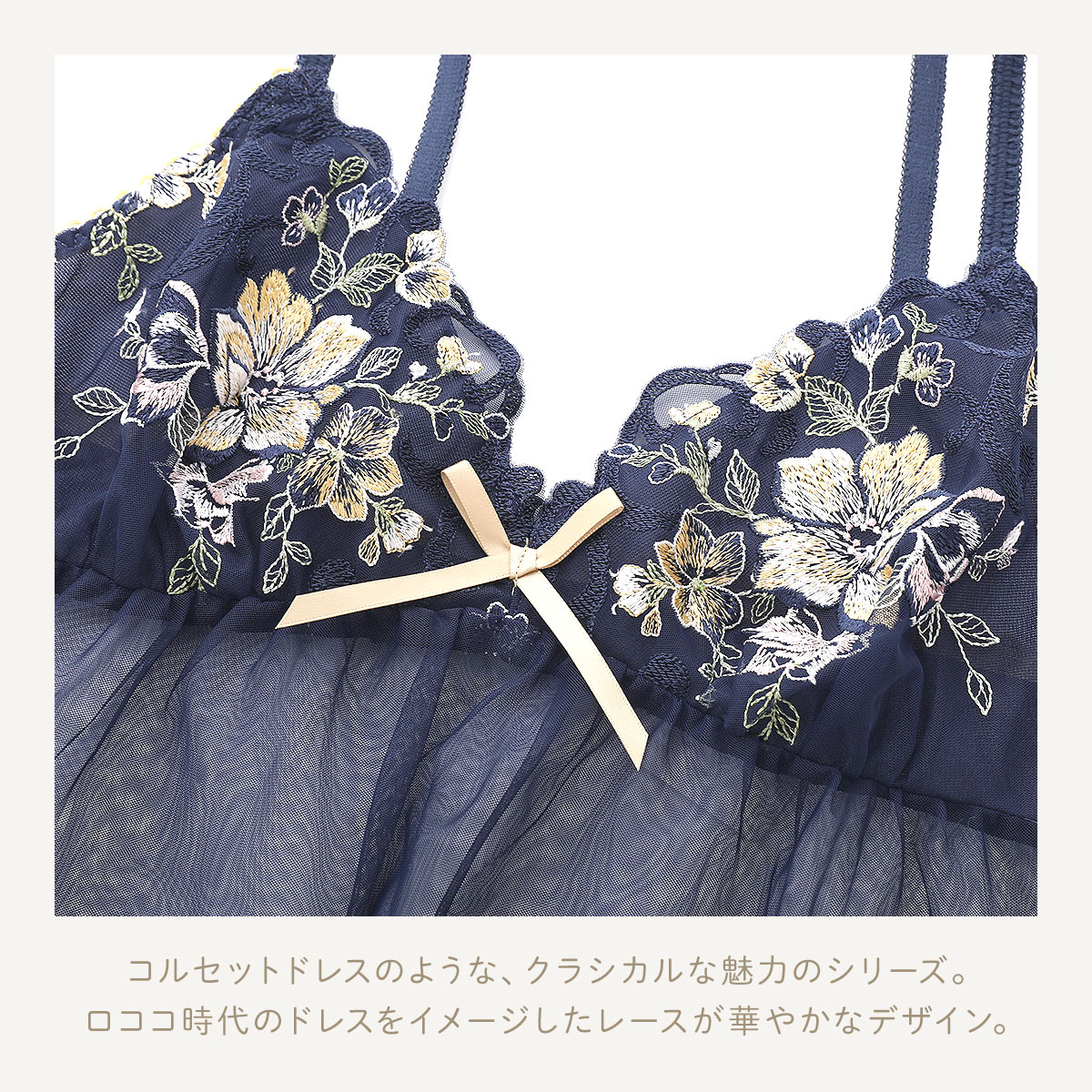 カップから裾までほどこされた曲線の刺しゅうは、格子状のステッチで太さを出して、思わず目をひくインパクトのあるデザインに。裾から上にかけて小花を散りばめて、華やかさを後押ししています。メインのお花の花芯は中心を空けることで、絶妙な抜け感と可愛らしさを表現しました。