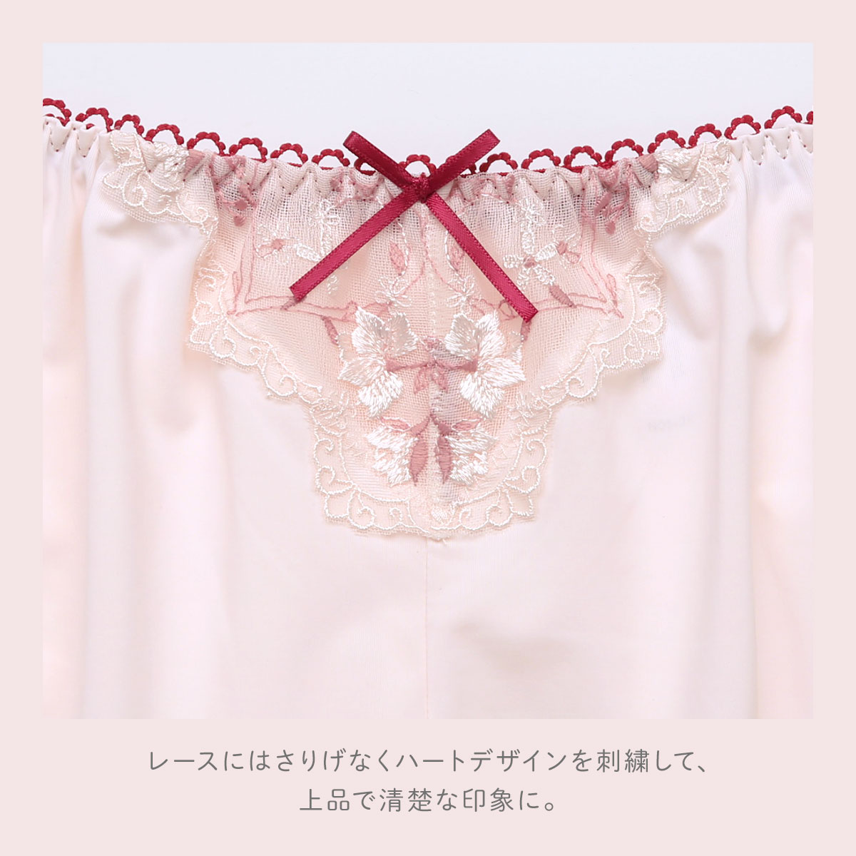 キラキラと輝く繊細な小花たちを散りばめた、リサマリ「フローチェ」コレクション。レースにはさりげなくハートデザインを刺繍して、上品で清楚な印象に。