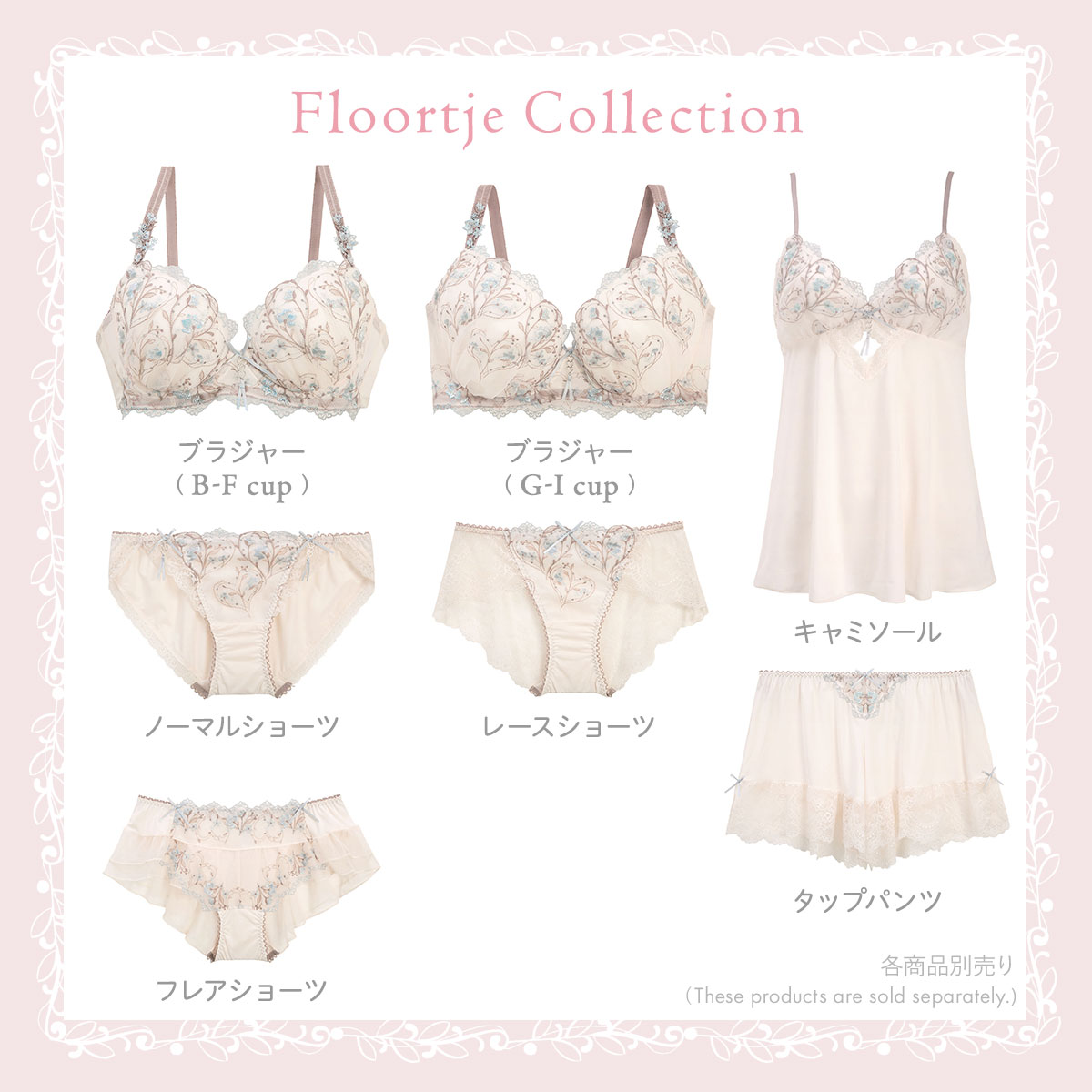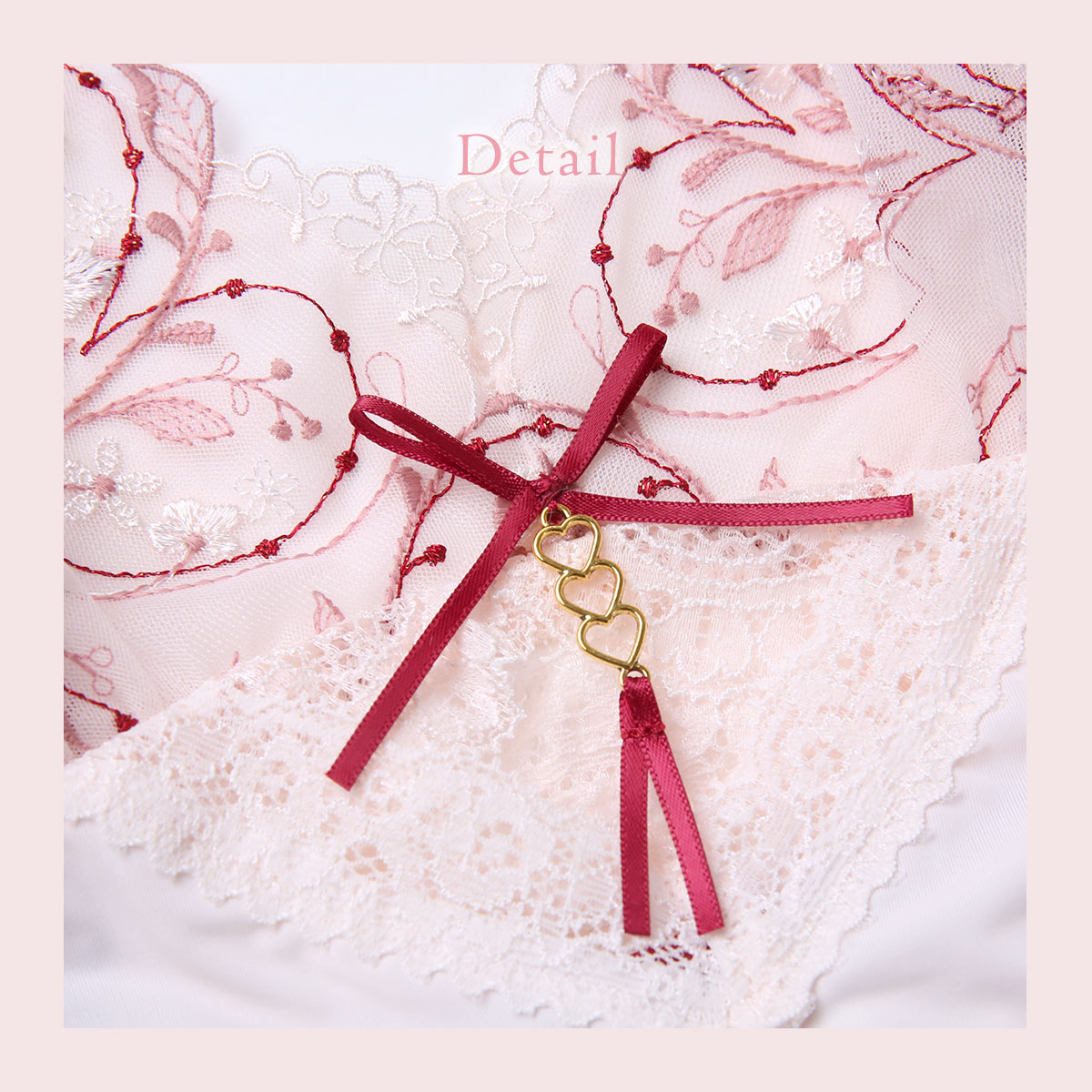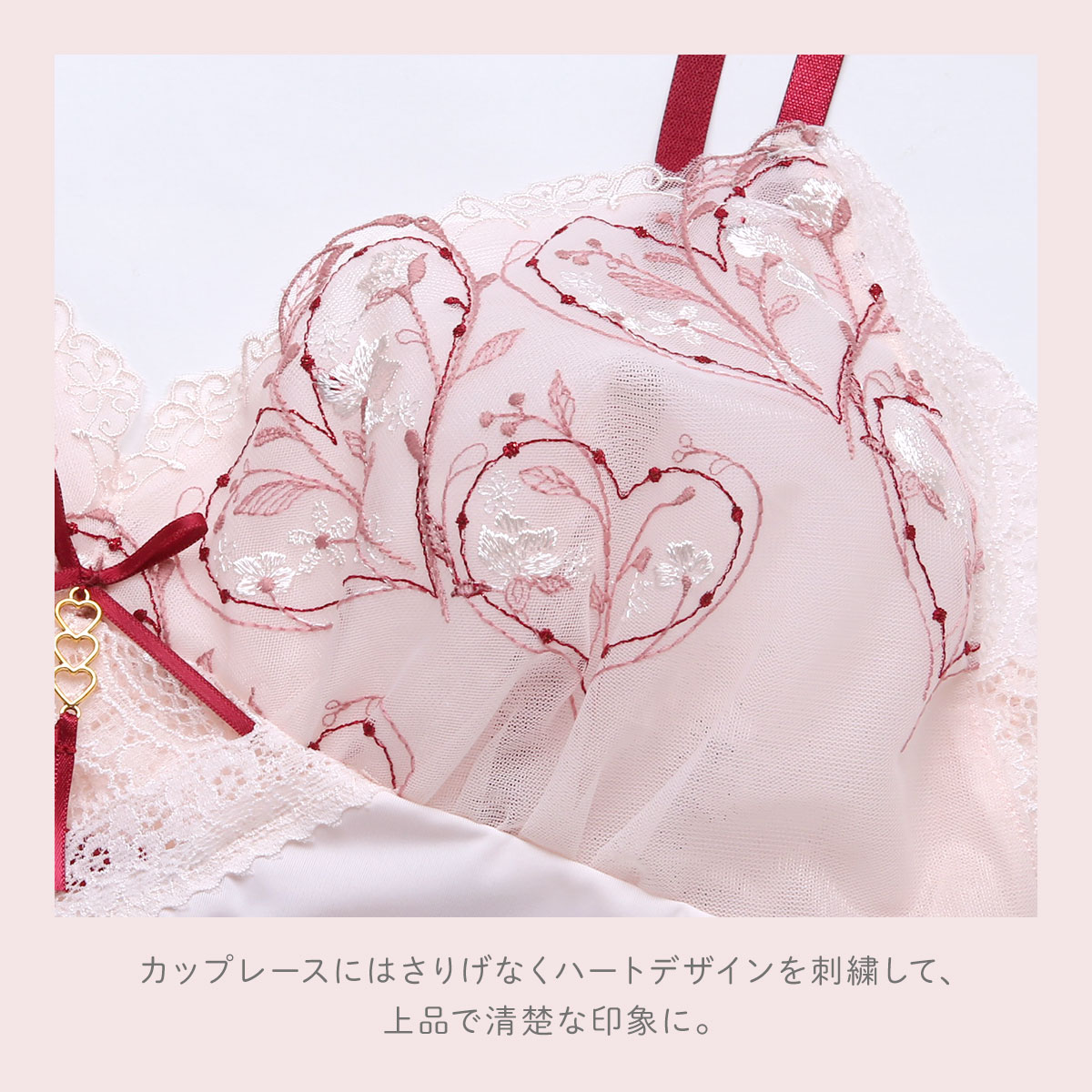 キラキラと輝く繊細な小花たちを散りばめた、リサマリ「フローチェ」コレクション。カップレースにはさりげなくハートデザインを刺繍して、上品で清楚な印象に。リボンにはタッセルをイメージした3連のハートチャームをあしらい、とびきりキュートに仕上げています。