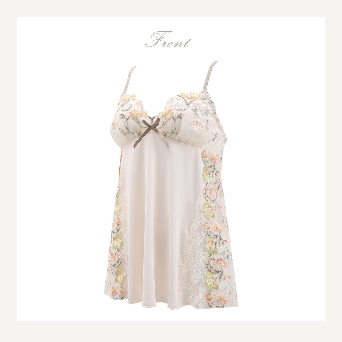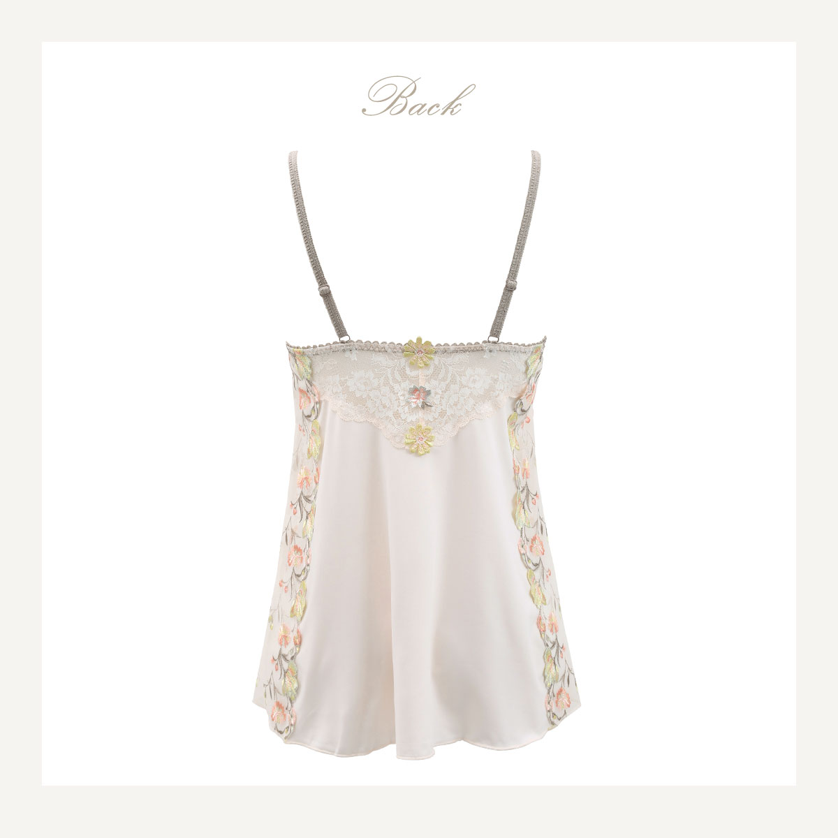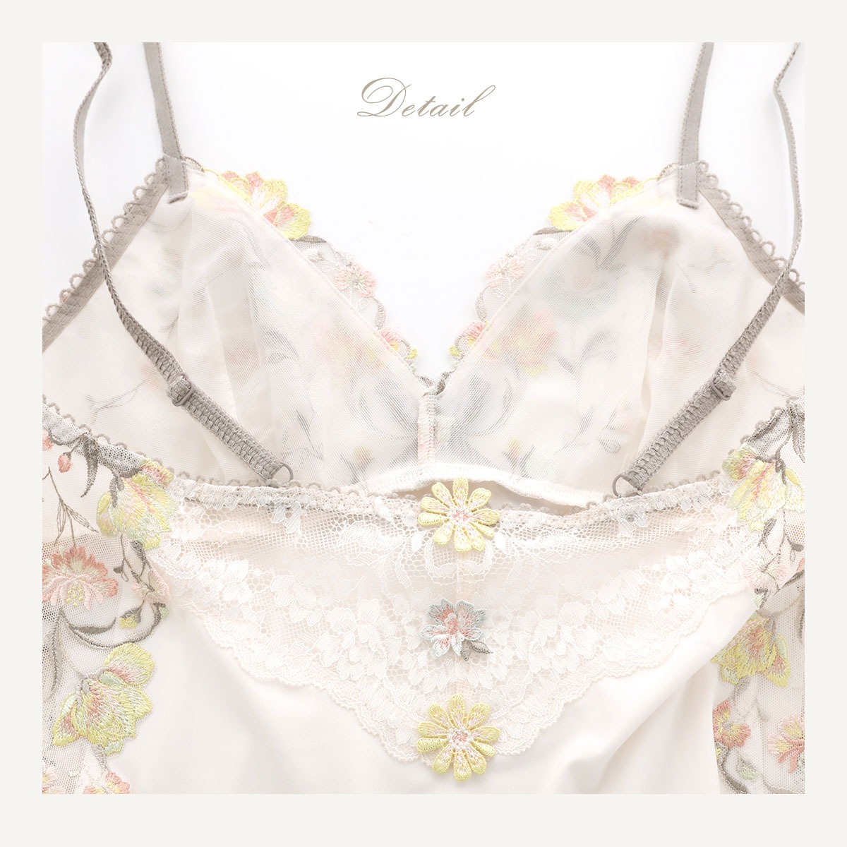 サイドまで豪華に刺繍を施したキャミソール。バックスタイルにはトライアングルカットしたお揃いのレースを使用し、デザインの異なるアップリケを縦に3つあしらいました。たくさんのお花たちが華麗に咲きほこる、オリジナリティあふれる大人のフラワーデザインです。