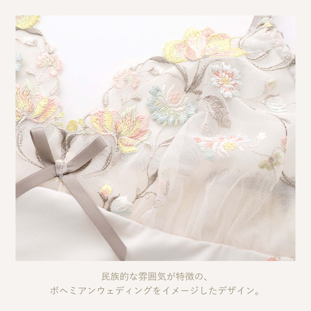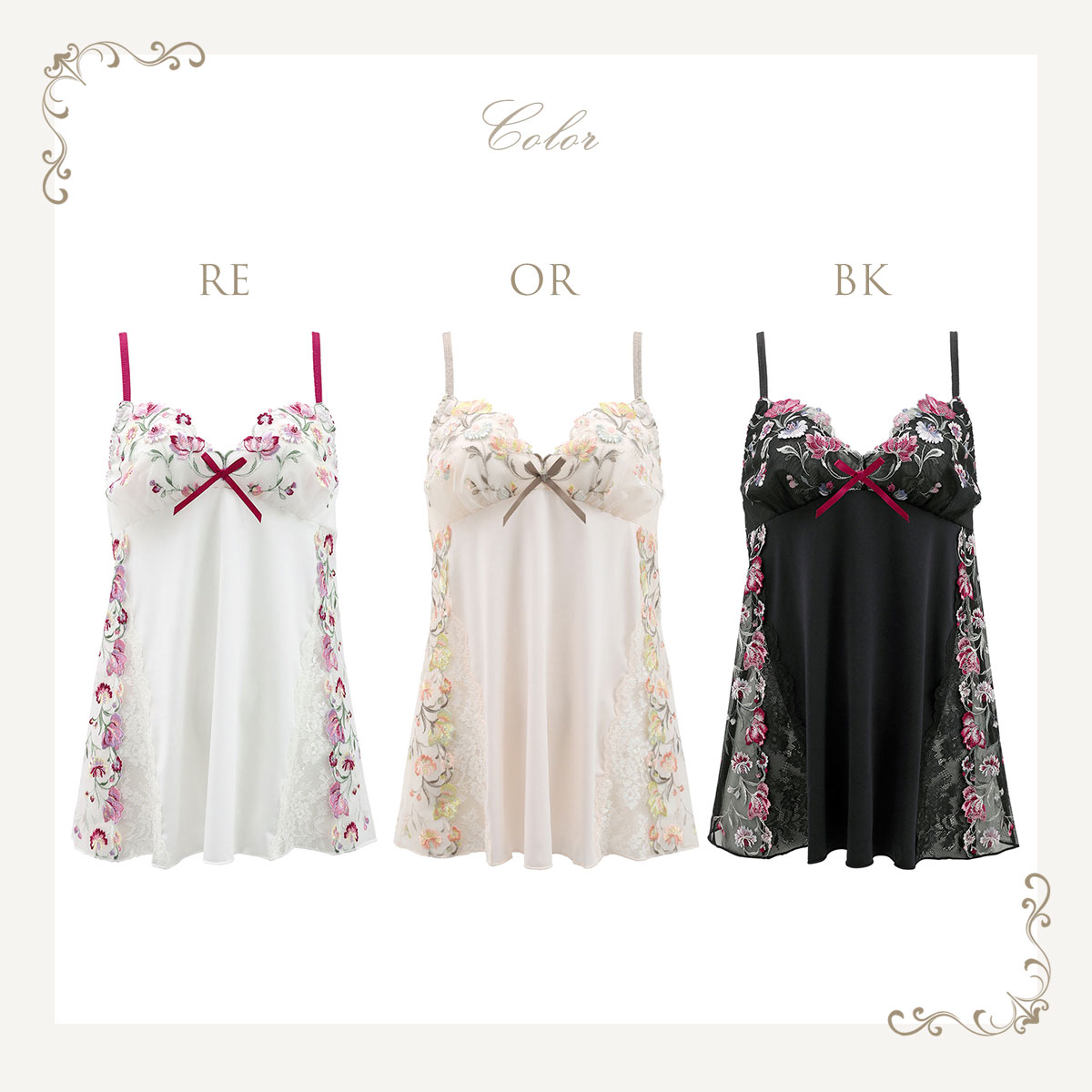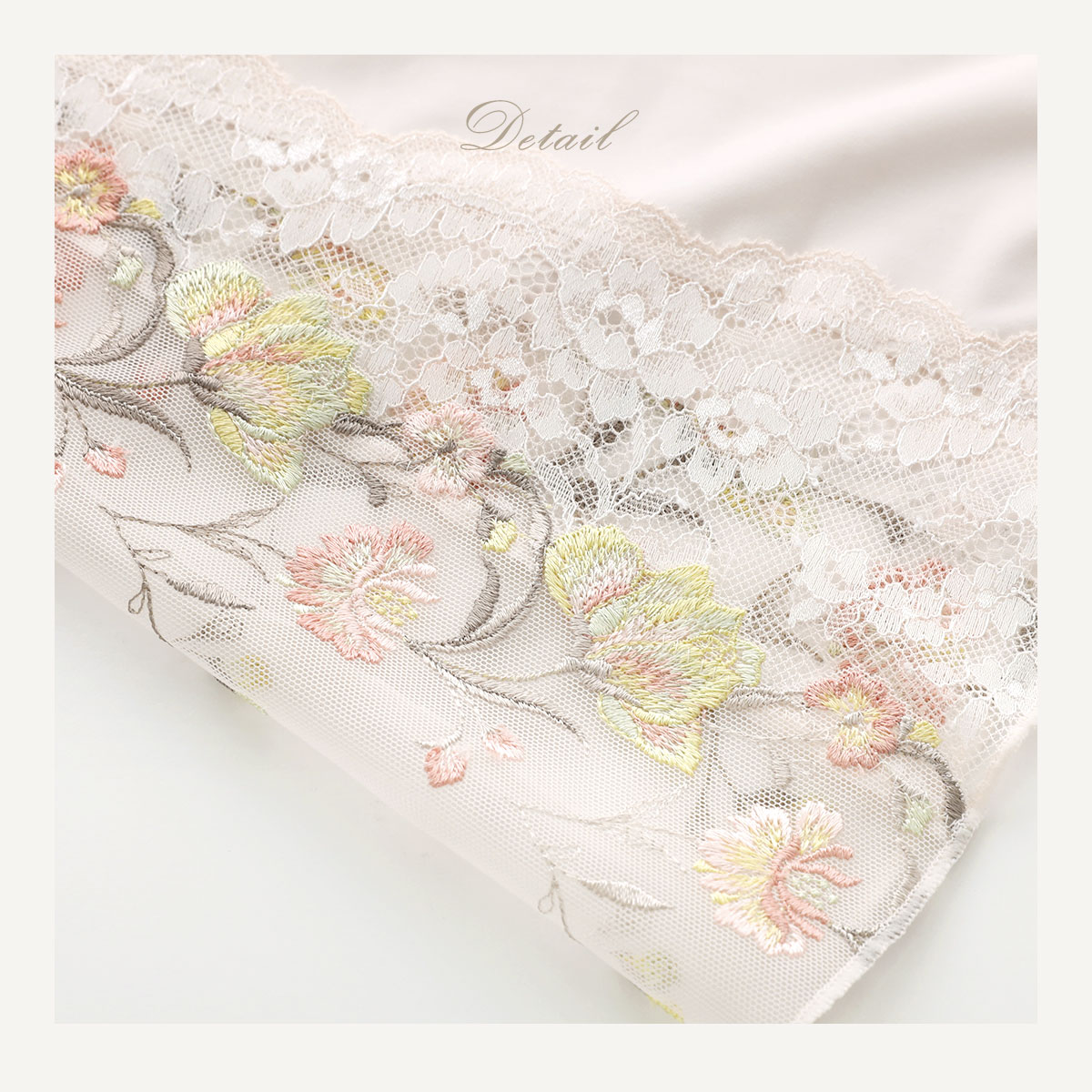サイドまで豪華に刺繍を施したキャミソール。バックスタイルにはトライアングルカットしたお揃いのレースを使用し、デザインの異なるアップリケを縦に3つあしらいました。たくさんのお花たちが華麗に咲きほこる、オリジナリティあふれる大人のフラワーデザインです。