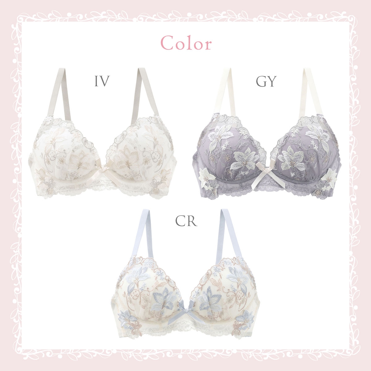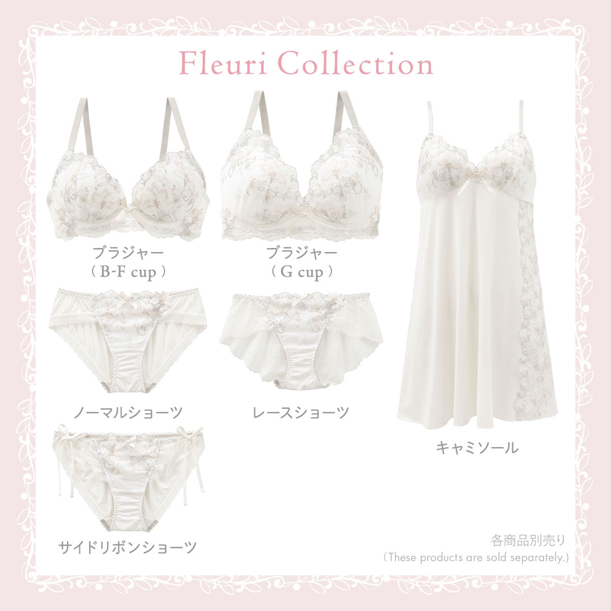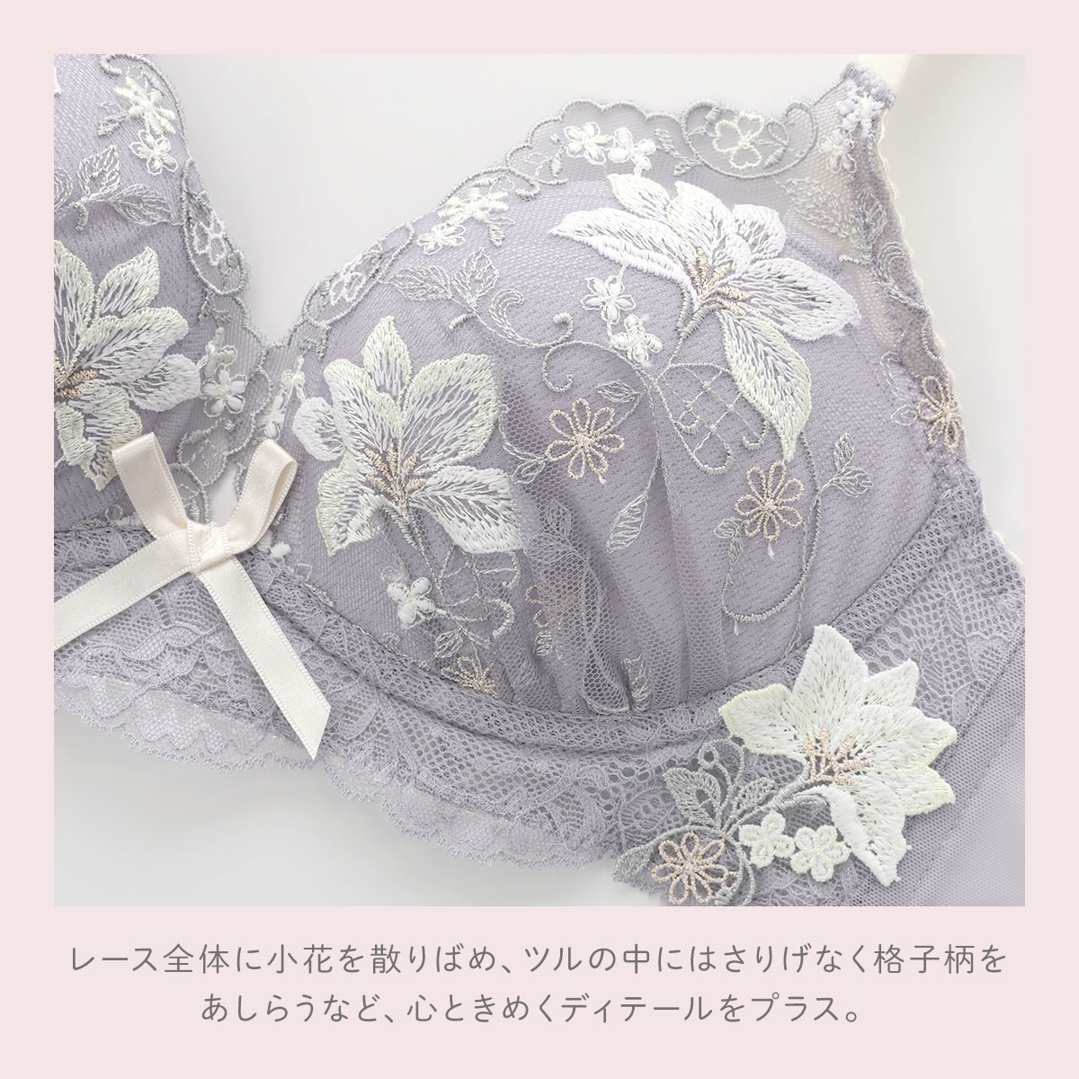 「幸せを運ぶ」ユリの花、カサブランカをイメージした、リサマリ「フルーリ」コレクションが、新機能のノンワイヤーシリーズになって登場。レース全体に小花を散りばめ、ツルの中にはさりげなく格子柄をあしらうなど、心ときめくディテールをプラスしました。サイドにはレースとペアのアップリケをあしらい、ブーケに包まれるような華やかな印象に。カラーはカサブランカの花言葉「純粋」「祝福」を連想させるような、スモーキーな優しいトーンで展開しています。