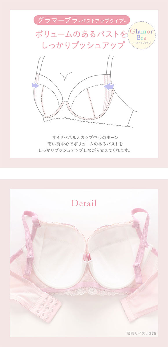 ボリュームのあるバストのためのグラマーブラ(バストアップタイプ)です。カップサイドのパネルで脇流れを防ぎしっかり固定。また、高い前中心とカップ中央部分のボーンで、バストをしっかり支えてくれます。パッドポケット付きなので、お手持ちのパッドでボリュームを調整できます。ホックは3段3列なので安定感があります。