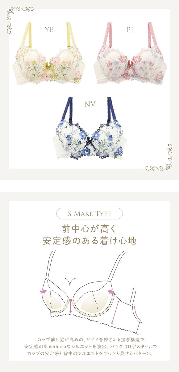 カップ前と脇が高めの、サイドを押さえる接ぎ構造で安定感のあるSharpなシルエットを演出する、S Make Typeパターン。取り外し可能なパッド付きです。バックはU字スタイルでカップの安定感と背中のシルエットをすっきり見せるパターンです。
