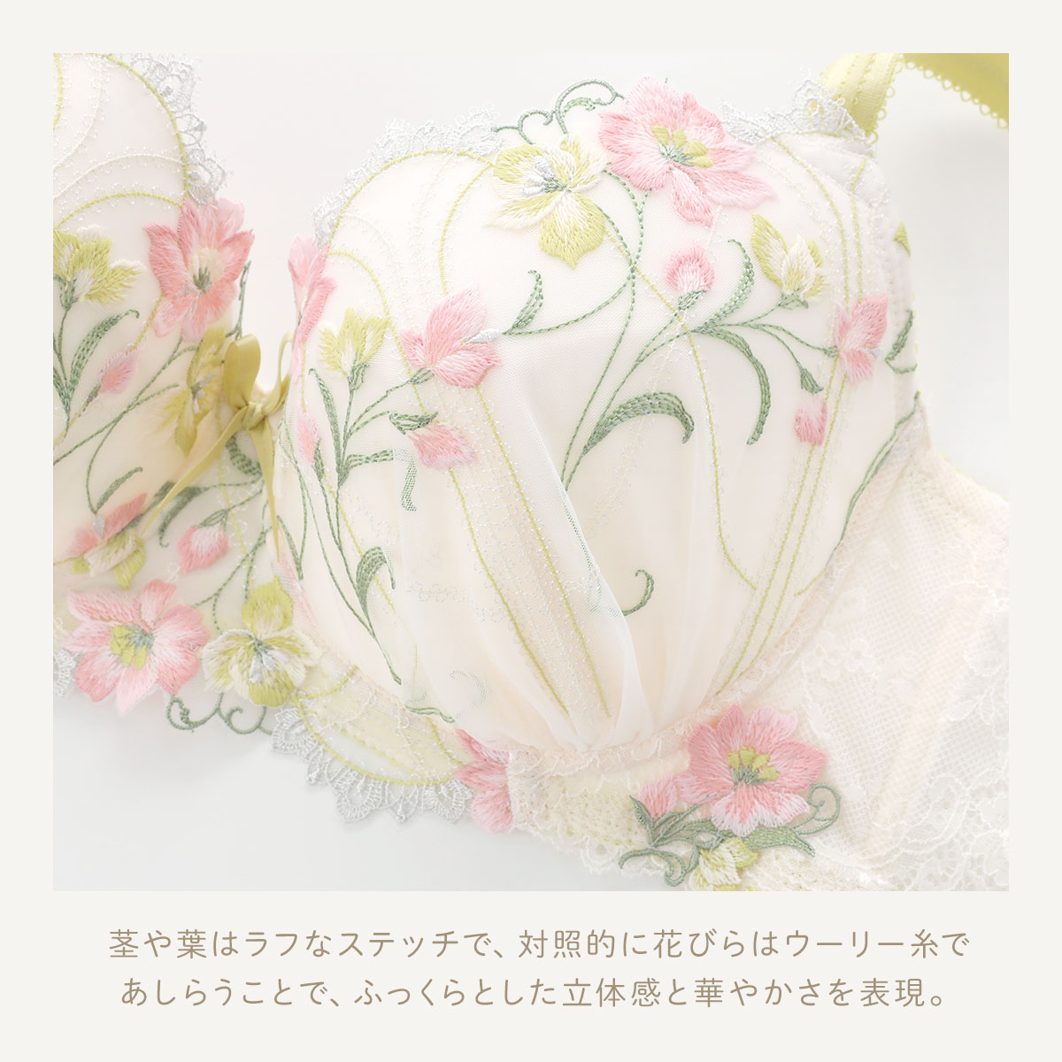 ハンガリーの伝統的なカロチャ刺しゅうをモチーフにした、リサマリレーヌ「テリン」コレクション。カラフルでインパクトのある大花模様をあしらったレースは、茎や葉はラフなステッチで、対照的に花びらはウーリー糸であしらうことで、ふっくらとした立体感と華やかさを表現。ポイントで特徴的な編み上げステッチをほどこすことで、よりクラフト感を演出しています。