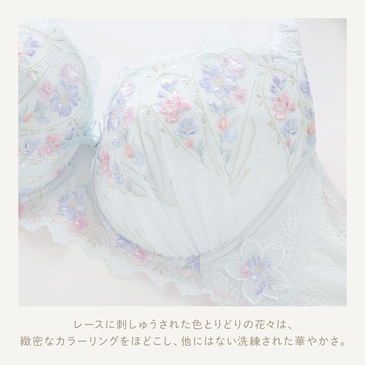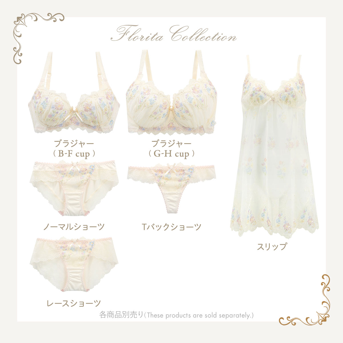 花々に囲まれたリゾートウェディングをイメージしたシリーズ、リサマリレーヌ「フロリタ」コレクション。レースに刺しゅうされた色とりどりの花々は、ポジショニングプリントで緻密なカラーリングをほどこし、他にはない洗練された華やかさに仕上がりました。お花の周りを縁取るハートのモチーフは、キラキラとした繊細なラメ糸であしらい、上品な輝きに。まるで額縁に飾られた絵画のような、美しい佇まいを演出します。