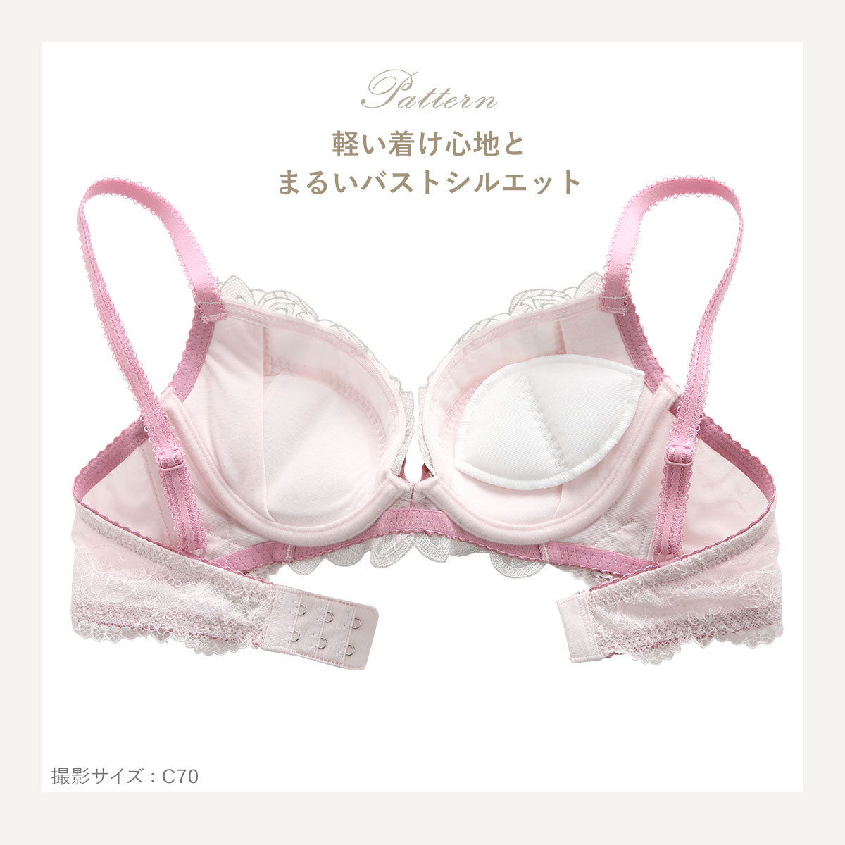 L字ワイヤーを使用し、前中心が低く、谷間ができるパターンです。取り外し可能パッドでボリューム調整もできます。カップ裏のサイドには、脇に流れるバストを引き寄せるパネル付きで、脇もすっきり。