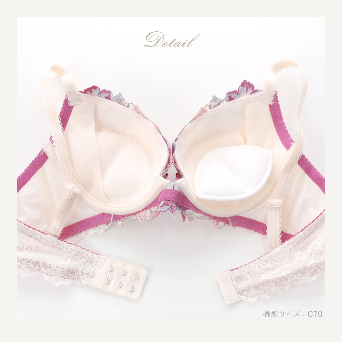 前中心が低いワイヤーとカップのサイドパネルで、バストを中央に寄せて美しいV字を演出する、V Make Typeパターンです。取り外し可能なパッドでボリューム調整もできます。カップ裏のサイドには、脇に流れるバストを引き寄せるパネル付きで、脇もすっきり。
