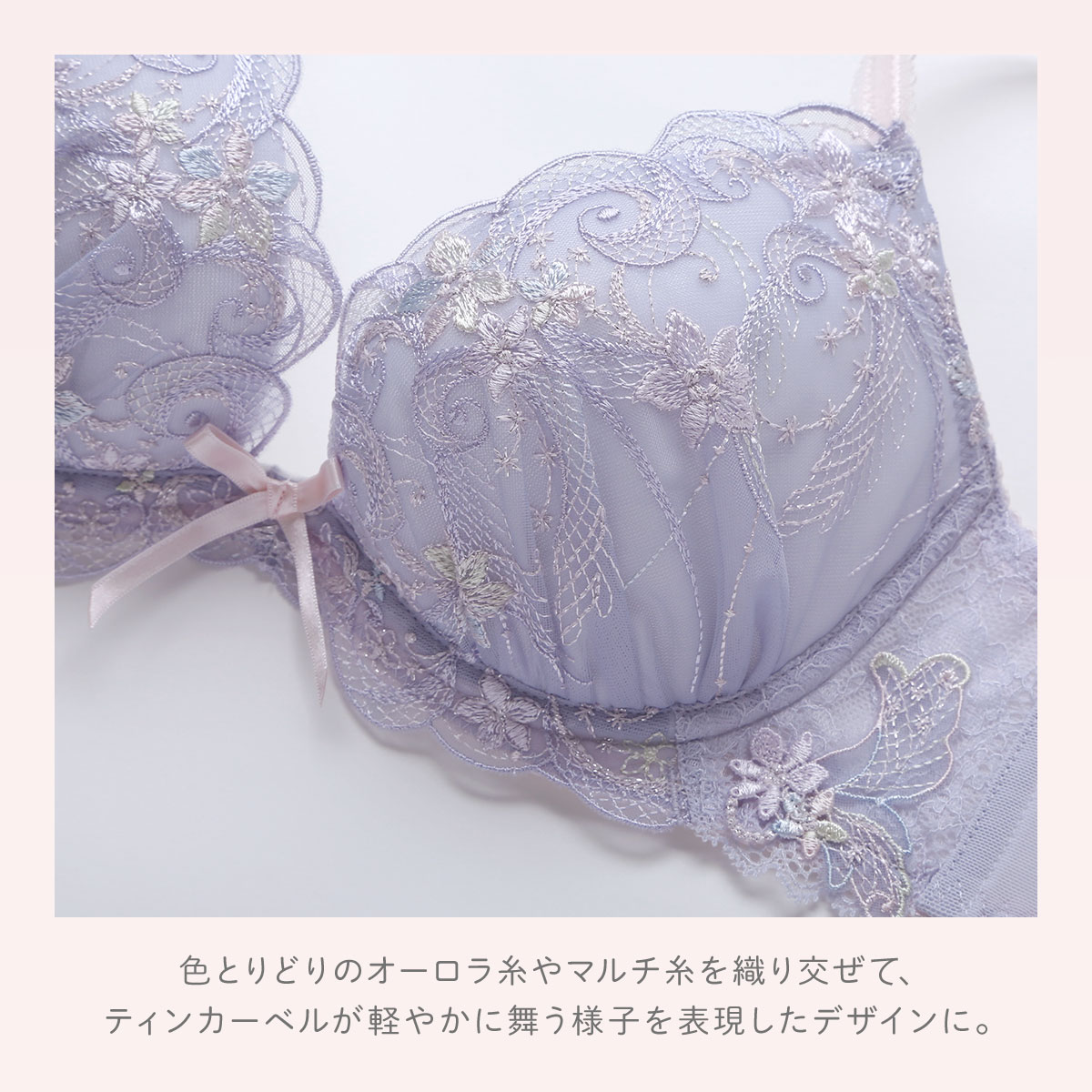 物語に登場する妖精「ティンカーベル」をモチーフにした「コリンナ」コレクション。くるくると曲線を描く羽で、ティンカーベルが軽やかに舞う様子を表現しています。色とりどりのオーロラ糸やマルチ糸を織り交ぜることで、妖精の光の粒子が放つ、夢のような輝きを演出。身に着けるだけでときめきの魔法をかけられるような、光の角度によって表情を変える繊細なきらめきのレースがロマンティック。