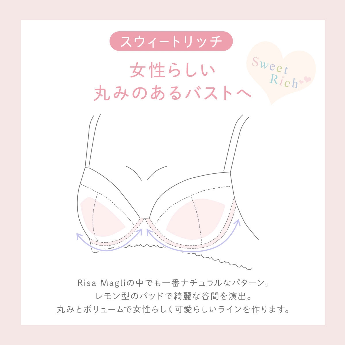 カップパターンは、ナチュラルな谷間と安定感、両方欲しい方におすすめのスウィートリッチパターンです。少し低めの土台があるため、安定感も兼ね備え、丸くて可愛い女性らしいシルエットを演出します。取り外し可能なパッドでボリューム調整もできます。