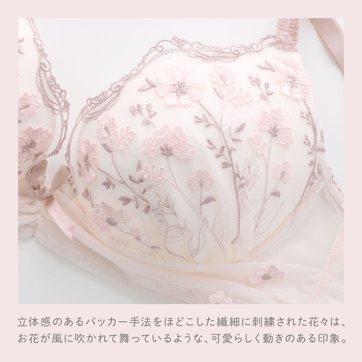 野に咲く花々を立体的に咲かせた、可憐なデザインの「ラーレ」コレクション。立体感のあるパッカー手法をほどこした、繊細に刺繍された花々は、可愛らしく動きのある印象。まるでお花が風に吹かれて舞っているような、新しい季節の訪れを感じるデザインです。