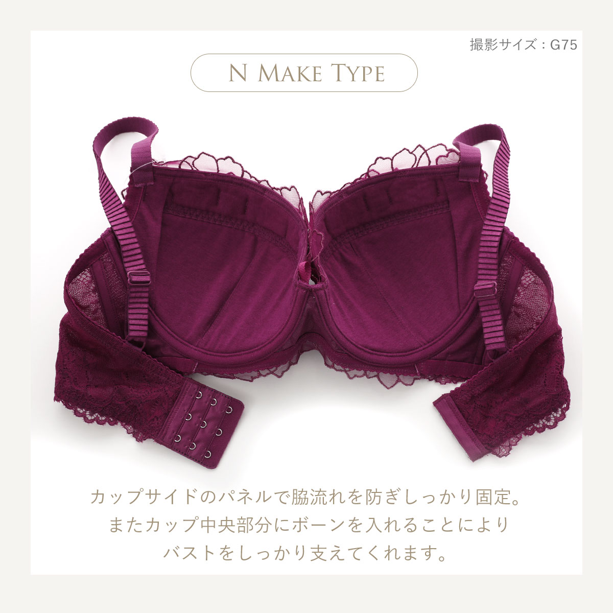 ボリュームのあるバストのためのグラマーブラ、N Make Type(ナチュラルタイプ)です。バージスラインに近いワイヤーを使用し、どんな体型の方でもフィットしやすいパターン。カップサイドのパネルで脇流れを防ぎしっかり固定。また、カップ中央部分にボーンを入れることにより、バストをしっかり支えてくれます。パッドポケット付きなので、お手持ちのパッドでボリュームを調整できます。ホックは3段3列なので安定感があります★