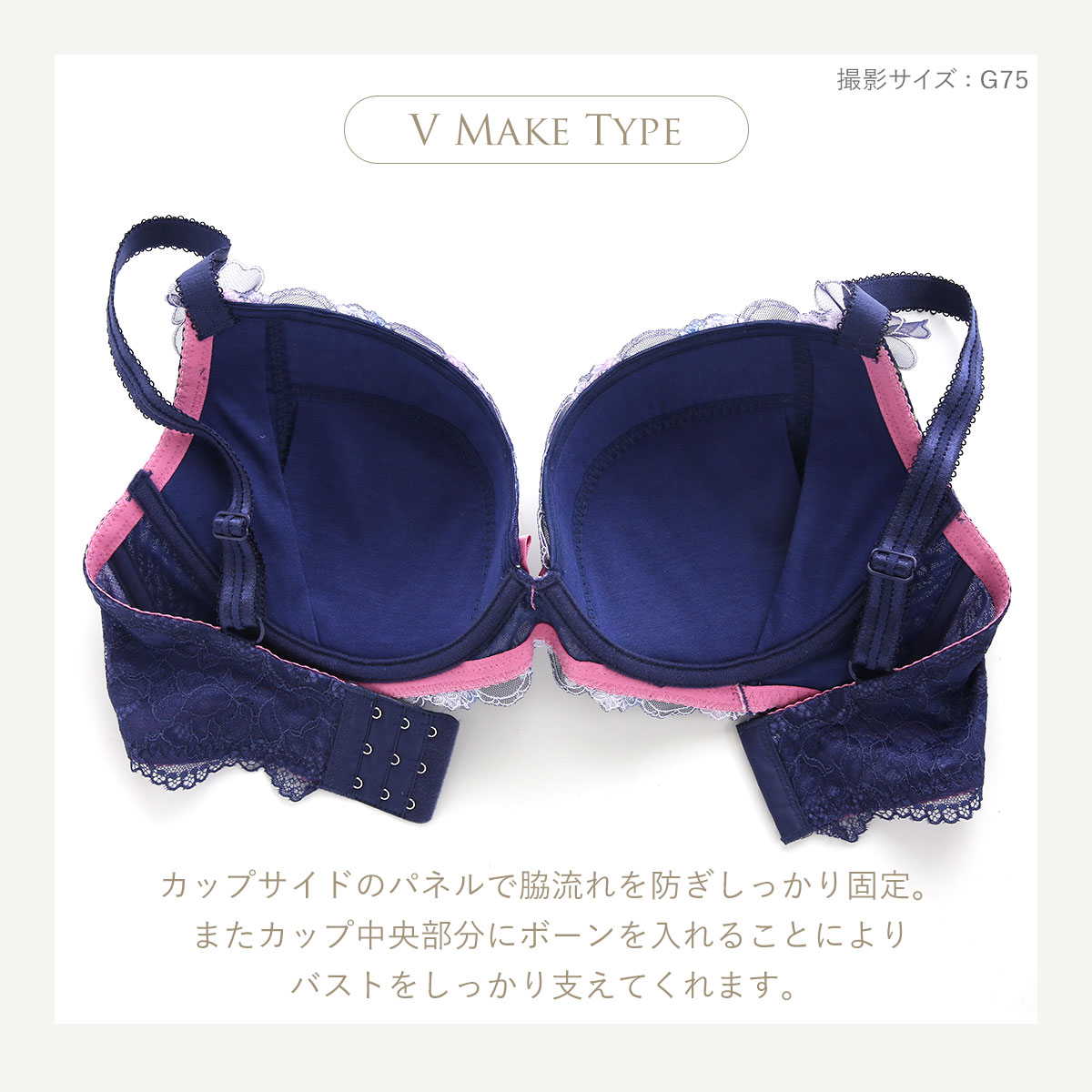 ボリュームのあるバストのためのグラマーブラ、V Make Type(浅型タイプ)です。カップサイドのパネルで脇流れを防ぎしっかり固定。また、カップ中央部分にボーンを入れることにより、バストをしっかり支えてくれます。パッドポケット付きなので、お手持ちのパッドでボリュームを調整できます。ホックは3段3列なので安定感があります★