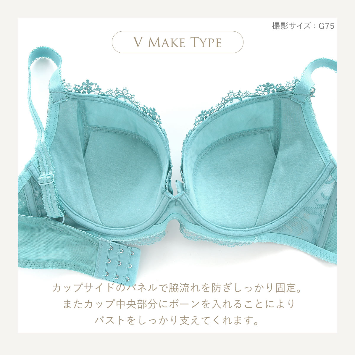 ボリュームのあるバストのためのグラマーブラ、V Make Type(浅型タイプ)です。カップサイドのパネルで脇流れを防ぎしっかり固定。また、カップ中央部分にボーンを入れることにより、バストをしっかり支えてくれます。パッドポケット付きなので、お手持ちのパッドでボリュームを調整できます。ホックは3段3列なので安定感があります★