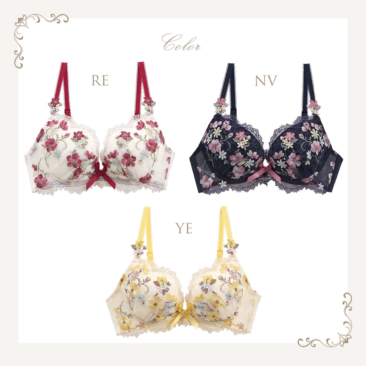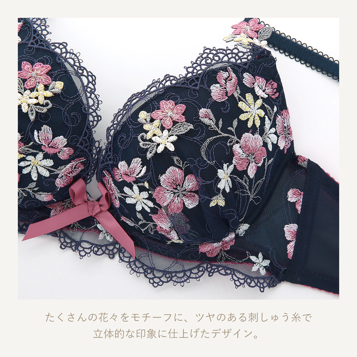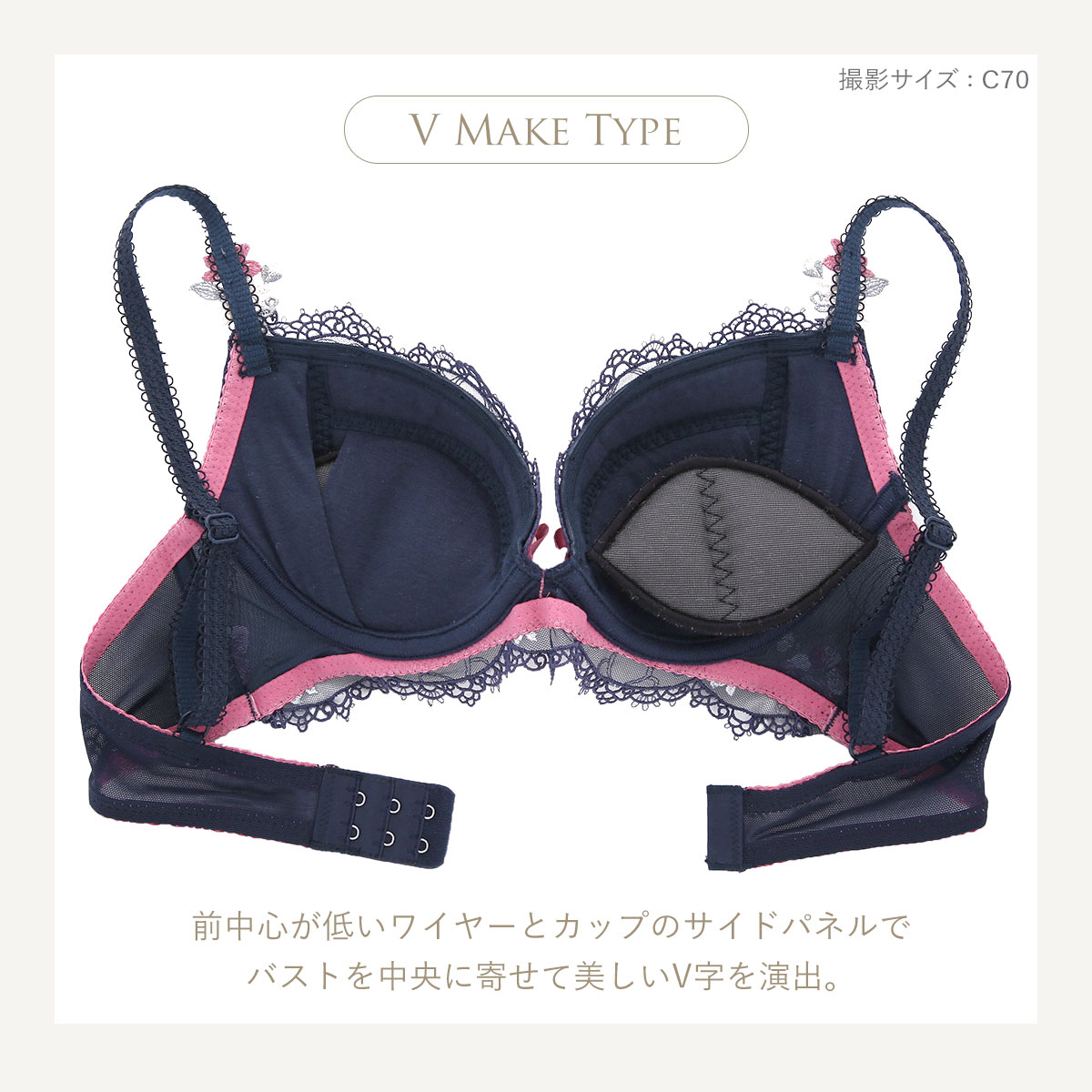 前中心が低いワイヤーとカップのサイドパネルで、バストを中央に寄せて美しいV字を演出する、V Make Type(浅型タイプ)パターンです。取り外し可能パッドでボリューム調整もできます。カップ裏のサイドには、脇に流れるバストを引き寄せるパネル付きで、脇もすっきり。