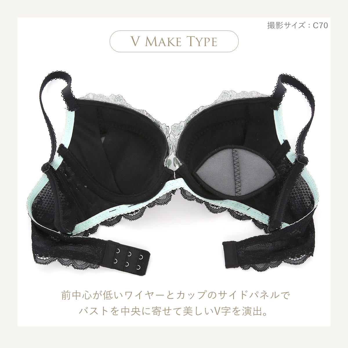 前中心が低いワイヤーとカップのサイドパネルで、バストを中央に寄せて美しいV字を演出する、V Make Type(浅型タイプ)パターンです。取り外し可能パッドでボリューム調整もできます。カップ裏のサイドには、脇に流れるバストを引き寄せるパネル付きで、脇もすっきり。