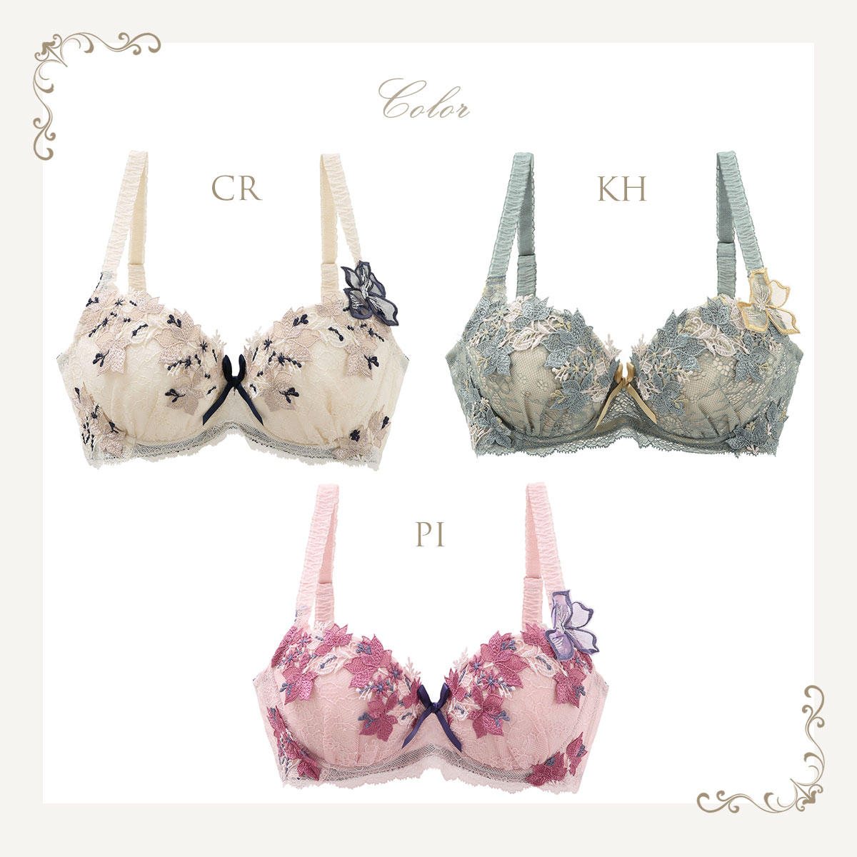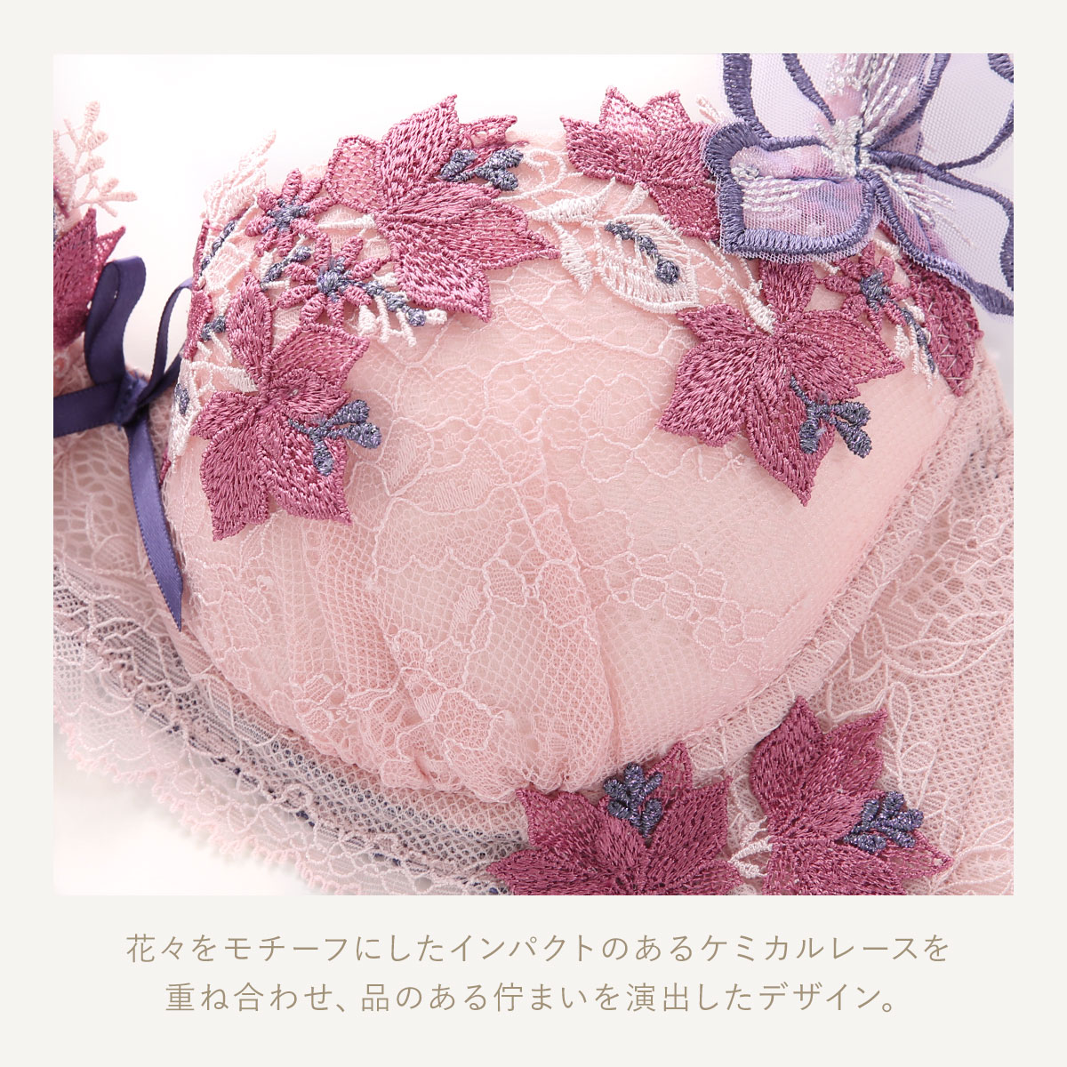 花々をモチーフにしたインパクトのあるケミカルレースを重ね合わせ、品のある佇まいを演出した、リサマリレーヌ「エレーナ」コレクション。カップサイドの異なるデザインのケミカルアップリケや、シアーなチュール素材のアップリケなど、異素材をMIXし斬新なデザインに仕上げています。