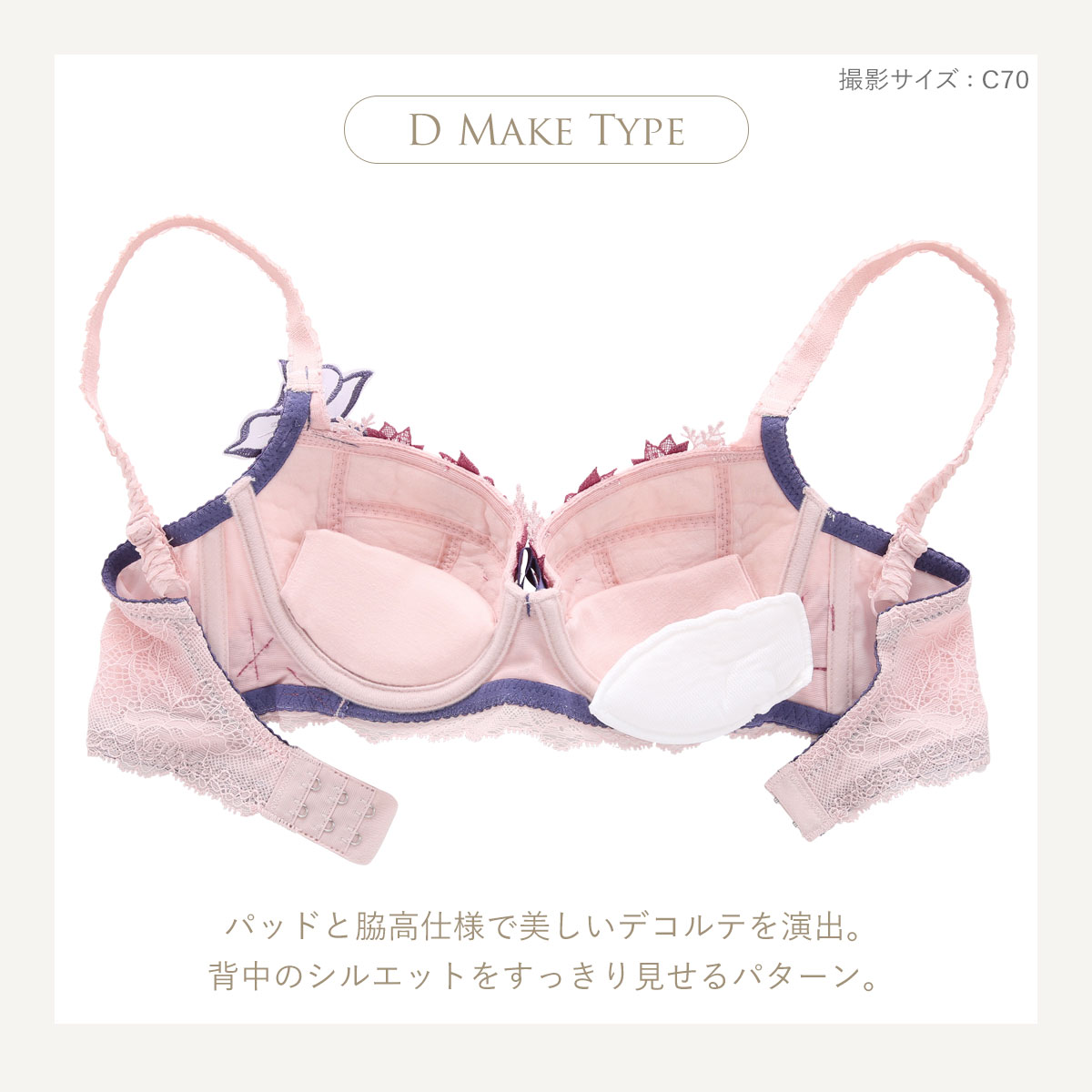 クッション性のあるパッドと脇高のサイドでふっくら谷間をメイクする、D Make Type(デコルテタイプ)。取り外し可能なパッドは、適度なハリ感を持たせながらもバストに柔らかくフィットします。カップサイドは、ボーンを斜めに付け、脇肉をバストへしっかりと寄せます。U字バックで安定感のある着け心地です。