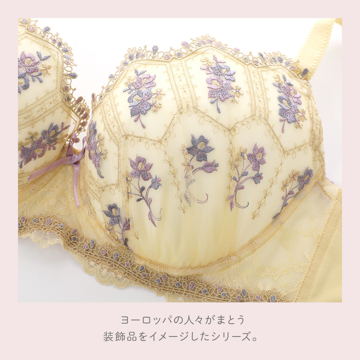 ヨーロッパの人々がまとう装飾品をイメージした「シーラ」コレクション。6角形の幾何学柄とフラワーモチーフを組み合わせたレースは、まるで一つ一つがブローチのような仕上がりに。色展開はデザインイメージに合わせて、華やかなアンティークさを演出しました。