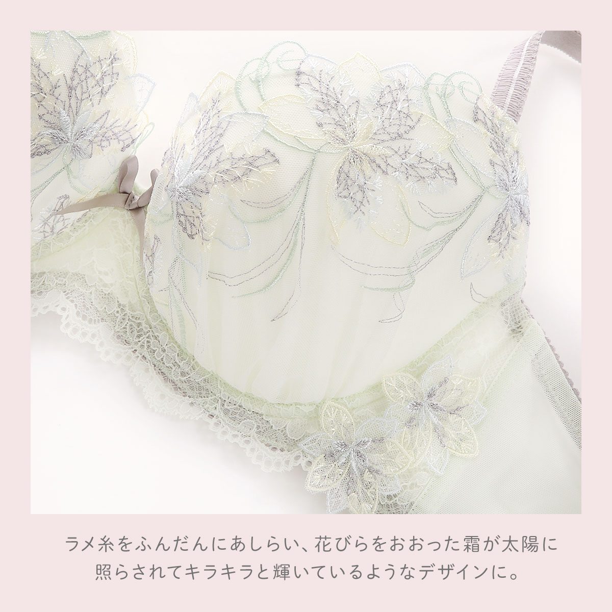 繊細で儚い雪の花をイメージした、リサマリ「ジェシカ」コレクション。雪の結晶のような模様を刺しゅうしたお花は、ラメ糸をふんだんにあしらい、花びらをおおった霜が太陽に照らされてキラキラと輝いているようなデザインに仕上がりました。