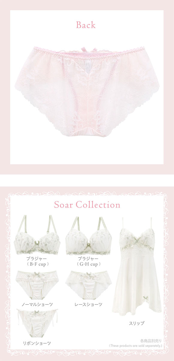 雨上がりのすずらんをモチーフにしたシリーズ、リサマリ「ソア」コレクション。レースにはリアルな表情のすずらんをあしらい、茎のクルクルしたディテールやキラキラと降り注ぐラメの粒が、清楚で可愛らしい印象に。大きめの曲線のスカラップはバイカラーにすることで、存在感と動きのあるデザインに仕上がりました。