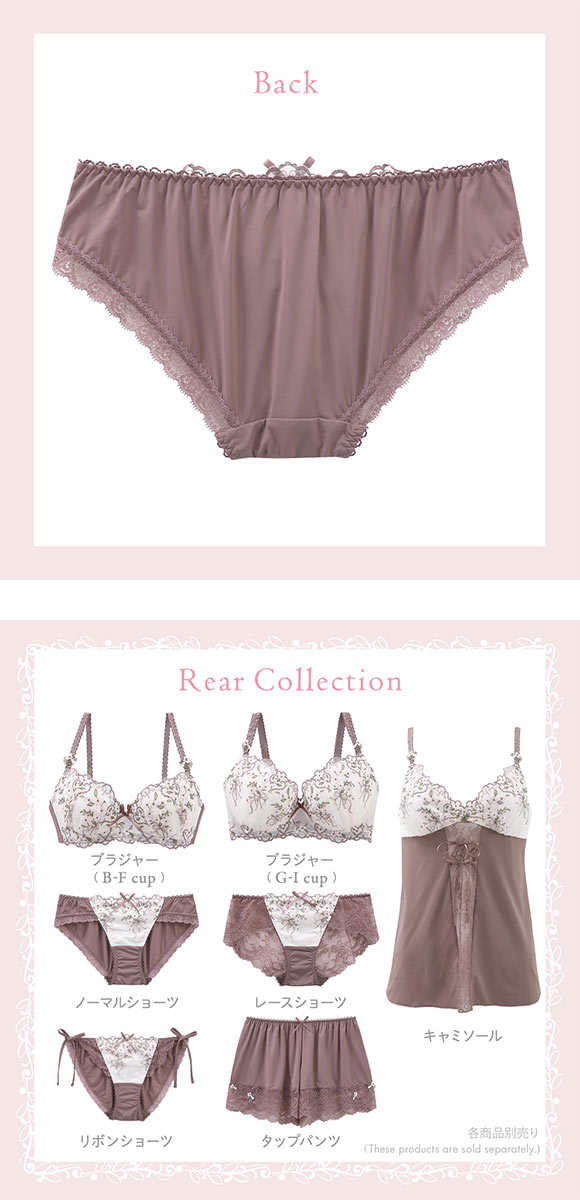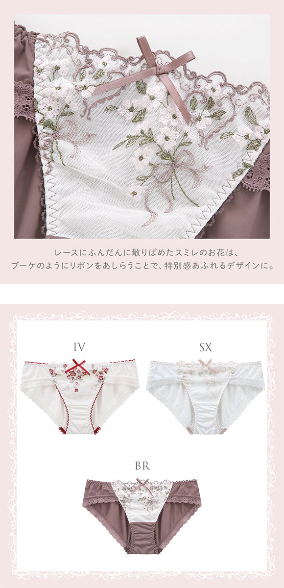 スミレのお花のブーケをイメージした、リサマリ「リア」コレクション。レースにふんだんに散りばめたスミレのお花は、ブーケのように束ねて揺れるリボンをあしらうことで、自分へのギフトのような特別感あふれるデザインに仕上がりました。