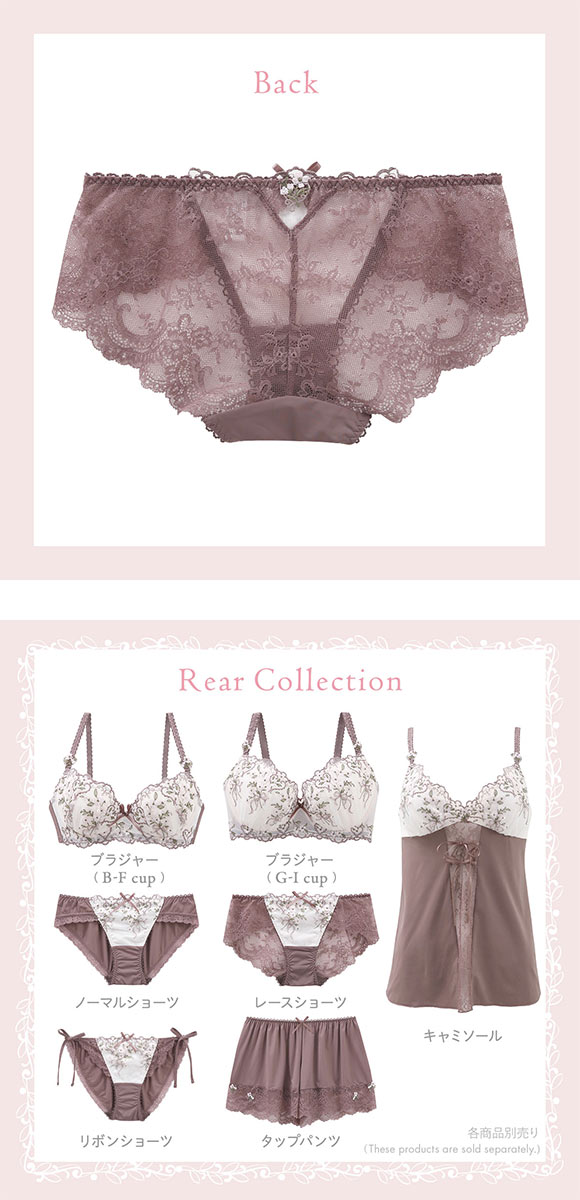バック全体にレースをあしらったレースショーツ。繊細なレースを使用し、美しい透け感。伸縮性があるのでほどよくヒップにフィットします。