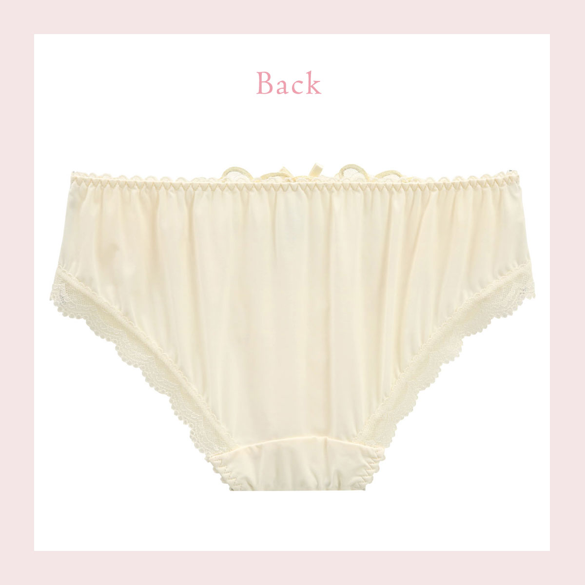 バックの身生地は、肌あたりなめらかな素材です。縦横にストレッチ性があり、ヒップにフィットします。バック足口はレース付きで後ろ姿も華やかに。