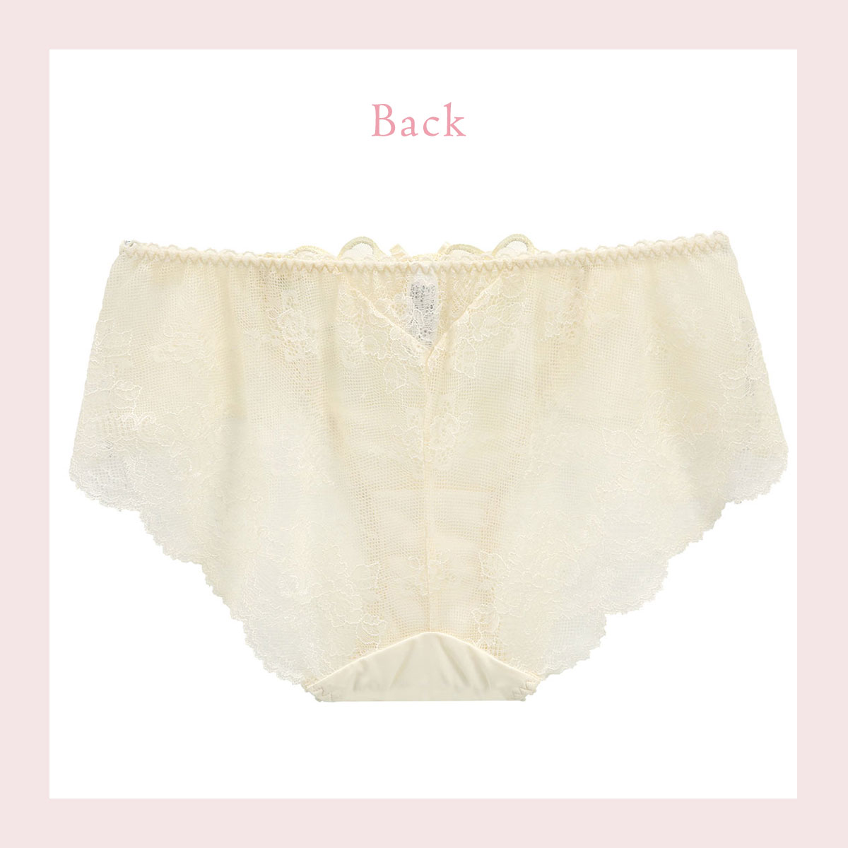 バック全体にレースをあしらったレースショーツ。繊細なレースを使用し、美しい透け感。伸縮性があるのでほどよくヒップにフィットします。ボトムスへもショーツラインが響きません。通気性がよく、快適に着用いただけます。