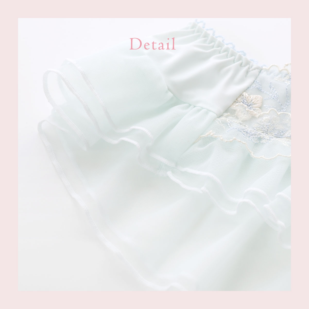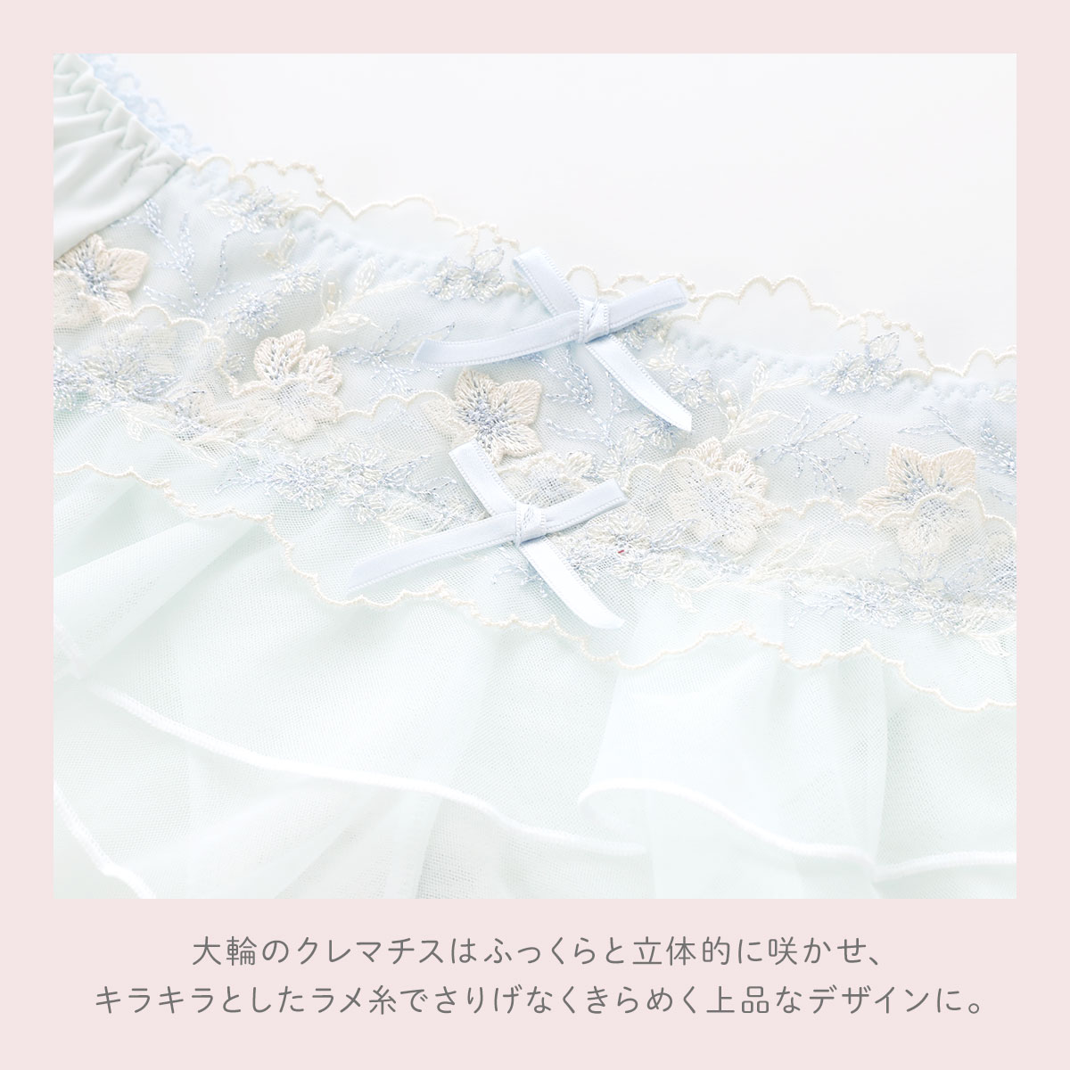 クレマチスの可憐な花々をモチーフに表現した、リサマリ「フリート」コレクション。フロント部分にあしらわれたギャザーたっぷりの軽やかなチュールレースがキュートな印象です。大輪のクレマチスは、パッカー手法でふっくらと立体的に咲かせ、キラキラとしたラメ糸でさりげなくきらめく上品なデザインに。