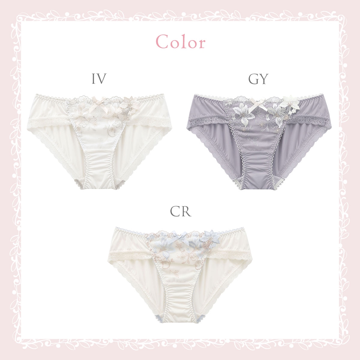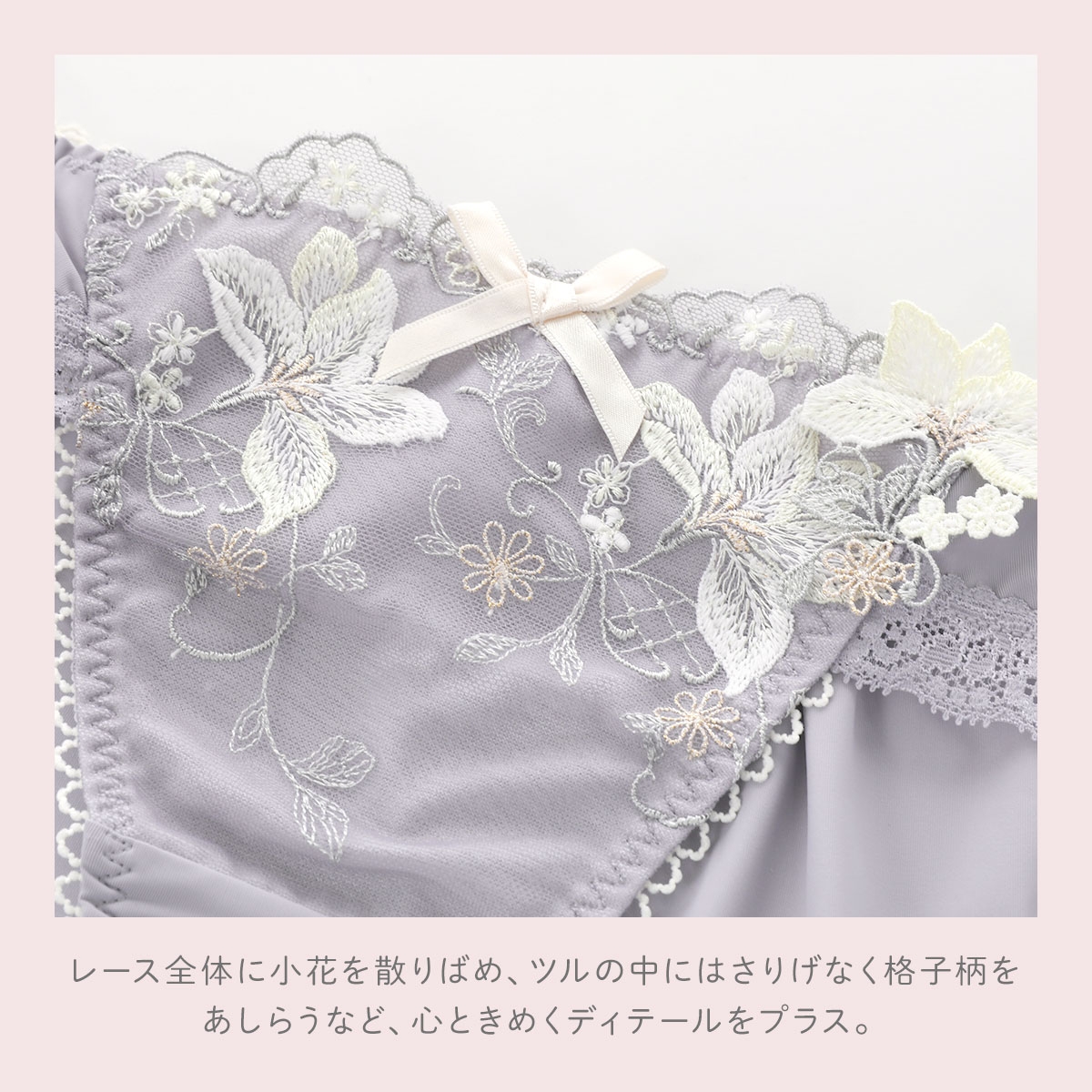 「幸せを運ぶ」ユリの花、カサブランカをイメージした、リサマリ「フルーリ」コレクションが登場しました。レース全体に小花を散りばめ、ツルの中にはさりげなく格子柄をあしらうなど、心ときめくディテールをプラス。サイドにはレースとペアのアップリケを添え、まるでブーケに包まれるような華やかな印象に仕上げています。カラーは、カサブランカの花言葉「純粋」「祝福」を連想させる、スモーキーで優しいトーンで展開しています。
