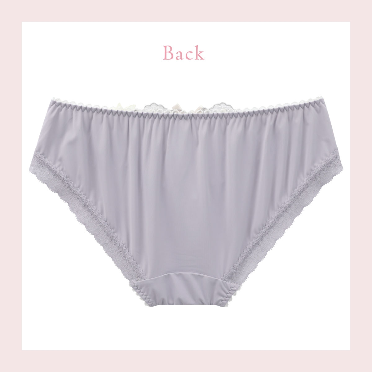 バックの身生地は、肌あたりなめらかな素材を採用。縦横にストレッチ性があり、ヒップに心地よくフィットします。バック足口はレース仕様で、後ろ姿も華やかに演出。