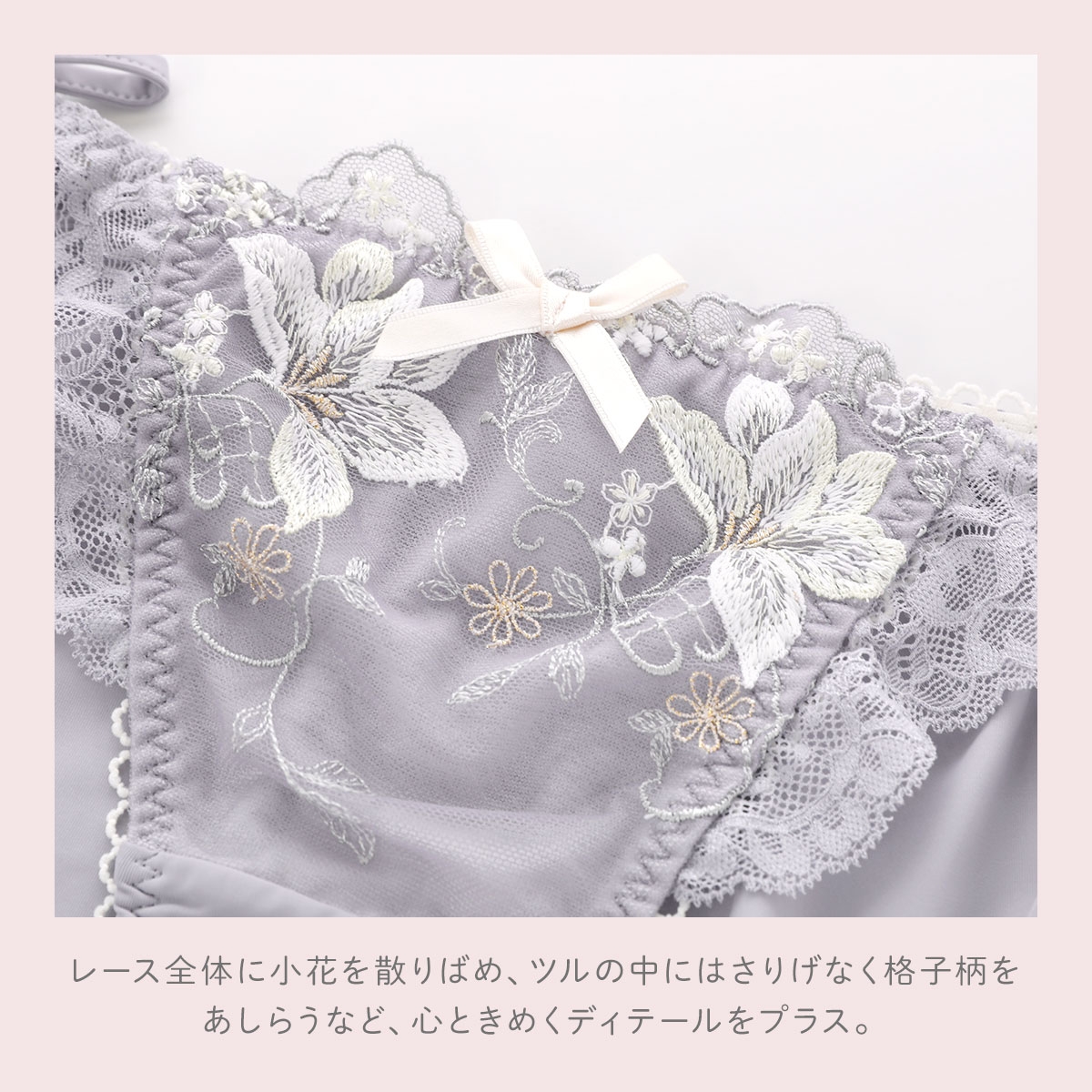 レース全体に小花を散りばめ、ツルの中にはさりげなく格子柄をあしらうなど、心ときめくディテールをプラスしました。カラーは、カサブランカの花言葉「純粋」「祝福」を連想させる、スモーキーで優しいトーンで展開しています。