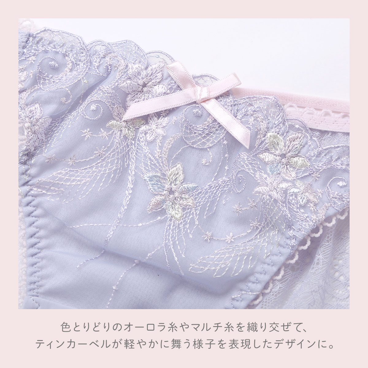 物語に登場する妖精「ティンカーベル」をモチーフにした「コリンナ」コレクション。くるくると曲線を描く羽で、ティンカーベルが軽やかに舞う様子を表現しています。色とりどりのオーロラ糸やマルチ糸を織り交ぜることで、妖精の光の粒子が放つ、夢のような輝きを演出。身に着けるだけでときめきの魔法をかけられるような、光の角度によって表情を変える繊細なきらめきのレースがロマンティック。