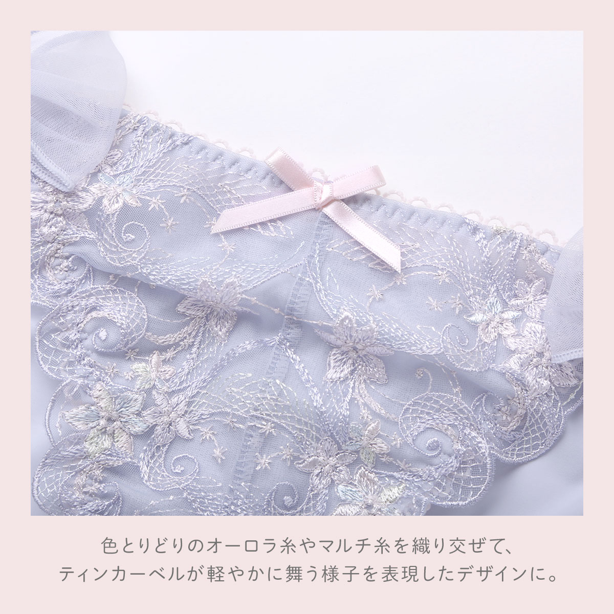 物語に登場する妖精「ティンカーベル」をモチーフにした「コリンナ」コレクション。くるくると曲線を描く羽で、ティンカーベルが軽やかに舞う様子を表現しています。色とりどりのオーロラ糸やマルチ糸を織り交ぜることで、妖精の光の粒子が放つ、夢のような輝きを演出。身に着けるだけでときめきの魔法をかけられるような、光の角度によって表情を変える繊細なきらめきのレースがロマンティック。