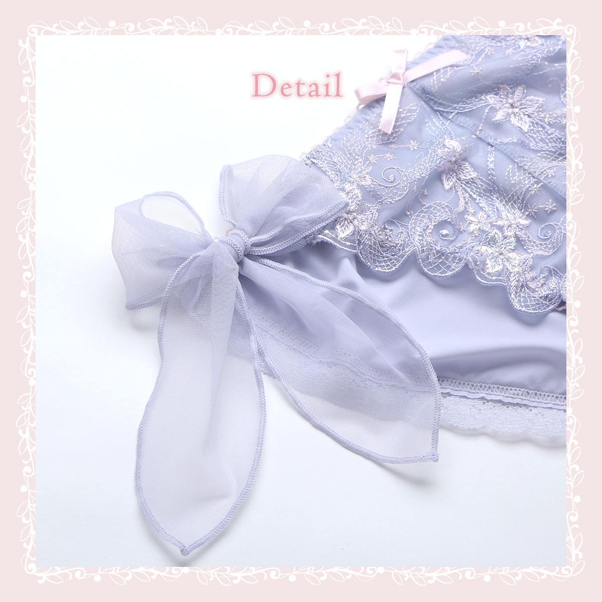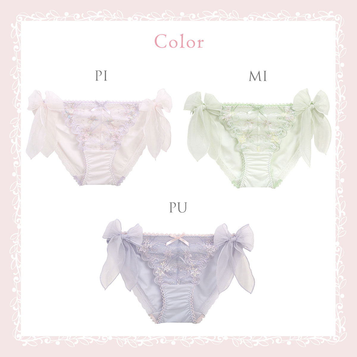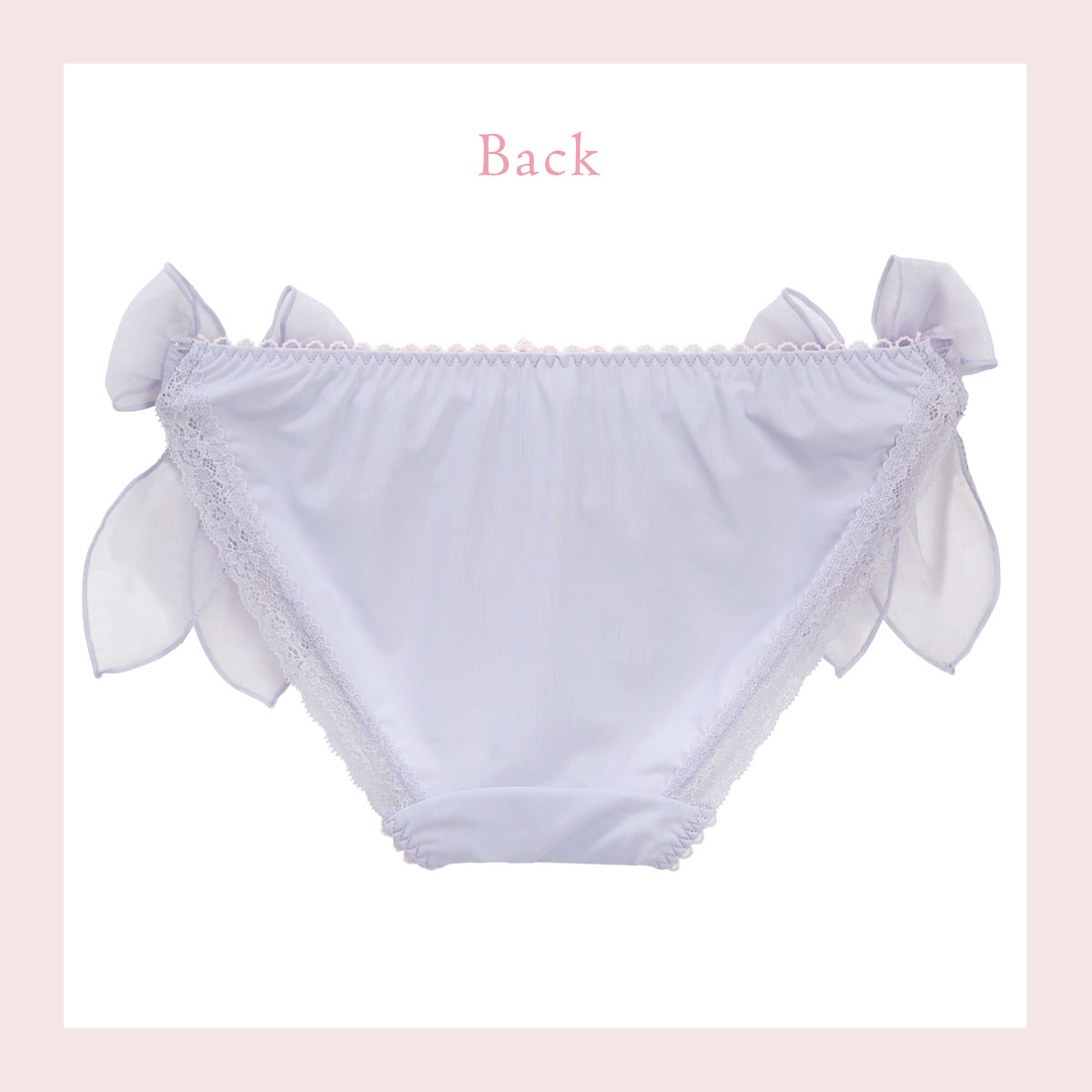 サイドがふんわりシフォンのほどけるリボンで、ちょっぴりセクシーなショーツ。バックの身生地は縦横にストレッチ性があり、なめらかな肌ざわりではき心地がいいです。足口はレース付きで華やかに。