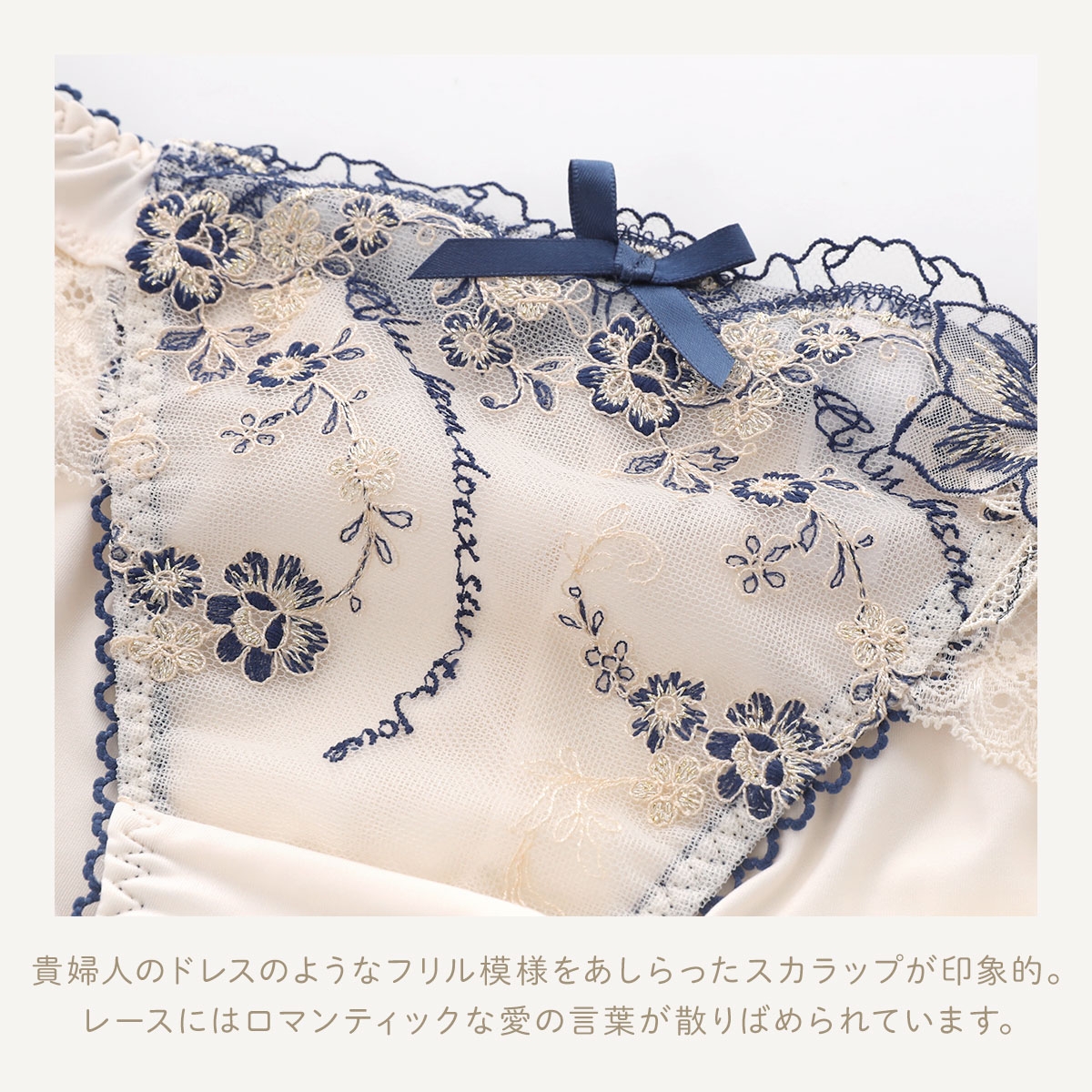優雅なアンティークの世界から生み出された、愛の言葉が散りばめられたシリーズ、リサマリレーヌ「アルベルタ」。まるでドレスをまとった貴婦人のように、繊細なフリル模様をあしらったスカラップが印象的です。レースには映画のワンシーンのようなロマンティックなセリフを散りばめています。「Un bisou doux sur ta joue(あなたの頬に優しいキスを)」「Amour(愛)」「Bisou(キス)」。
