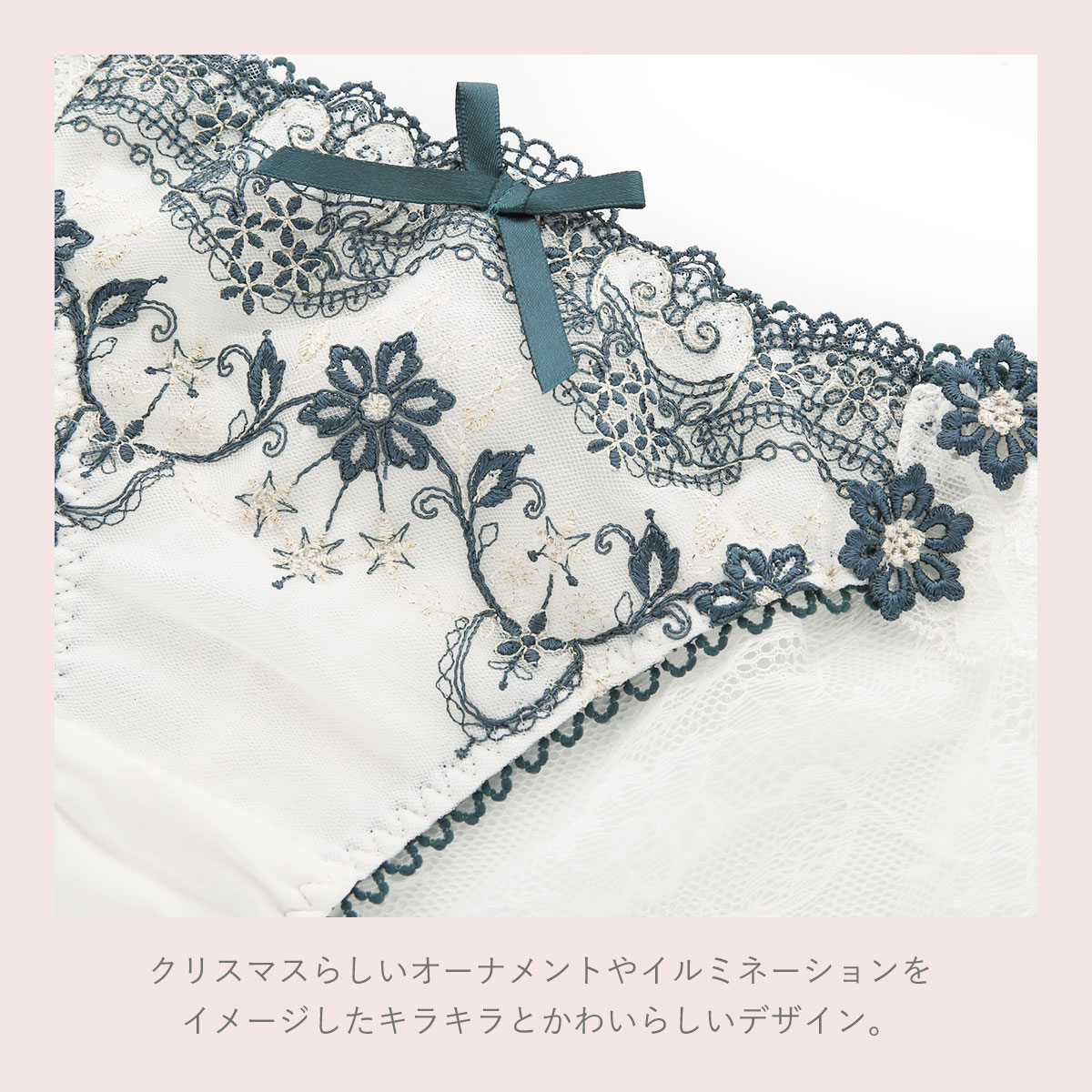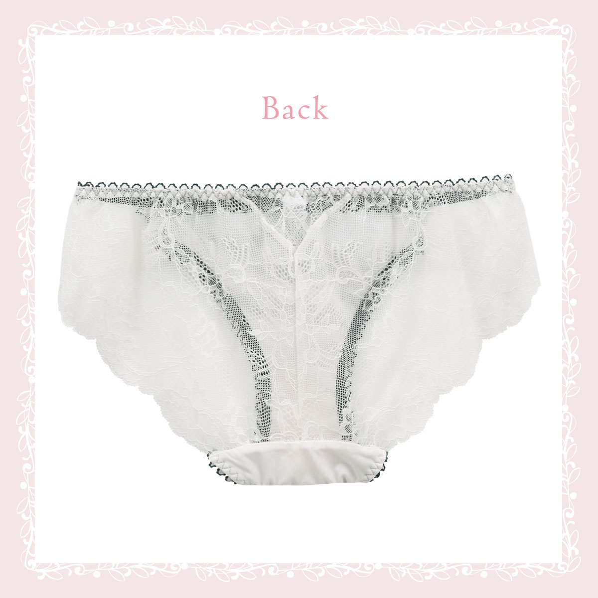 バック全体にレースをあしらったレースショーツ。繊細なレースを使用し、美しい透け感。伸縮性があるのでほどよくヒップにフィットします。