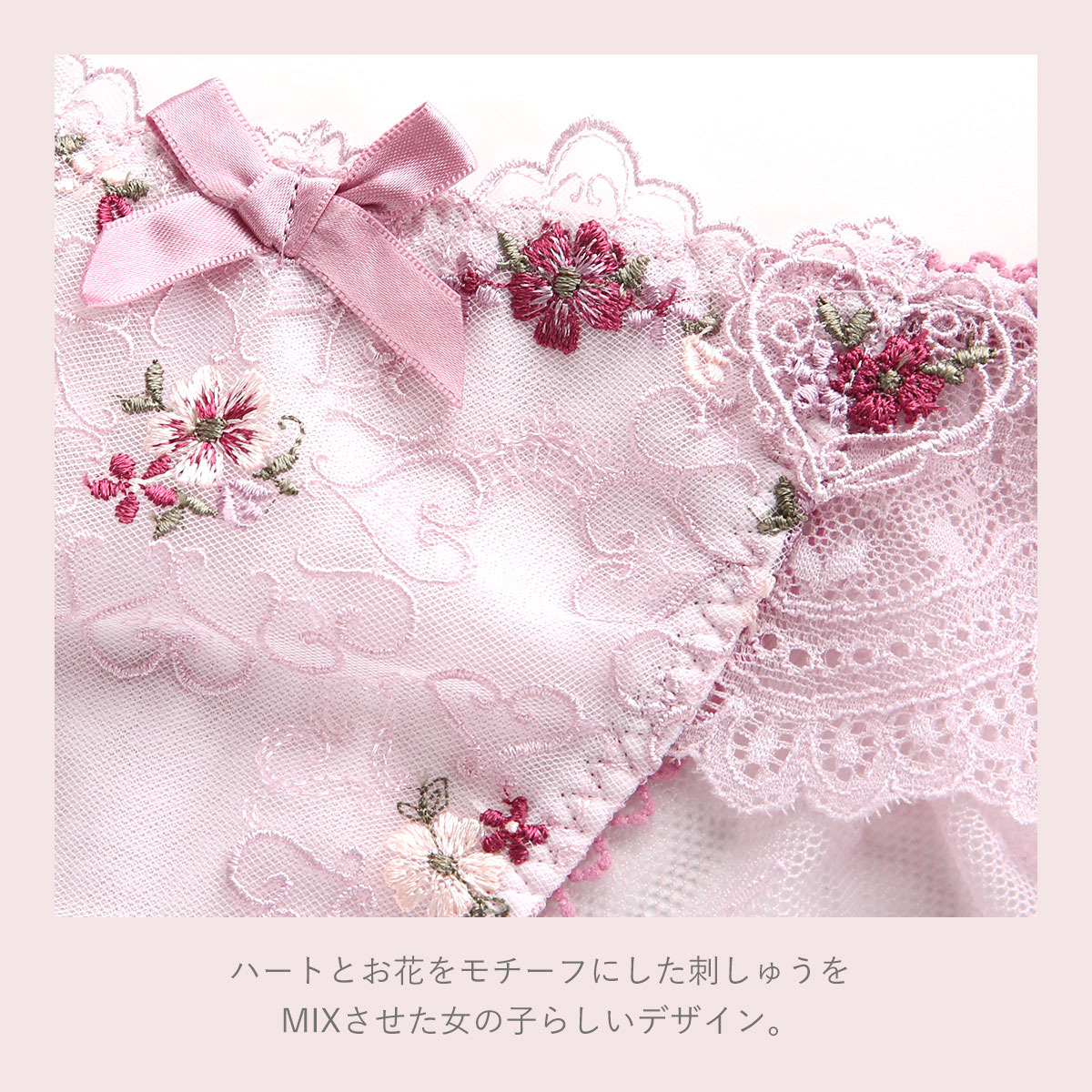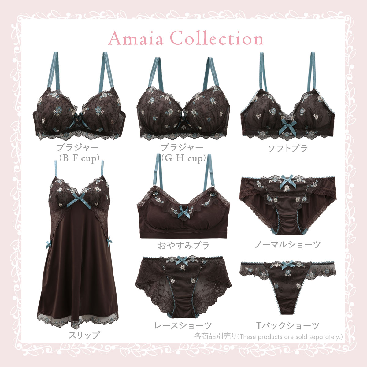 ハートとお花をモチーフにした刺しゅうをMIXさせた、女の子らしいデザインの「アマイア」コレクション。フロント部分に散りばめられたお花を小花でデザインすることで、甘すぎず大人っぽさも兼ね備えた雰囲気に仕上がりました。