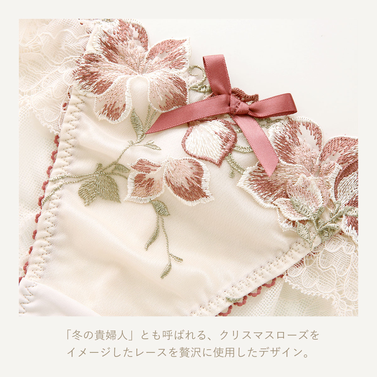 「冬の貴婦人」とも呼ばれる、クリスマスローズをイメージしたレースを贅沢に使用した、リサマリレーヌ「クレモンス」コレクション。グラデーションで表現した花びらや、ステッチの入り方のこだわりは、ラグジュアリーで大人な雰囲気を演出します。