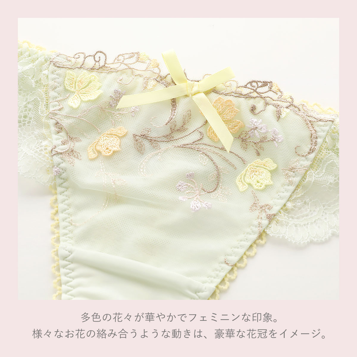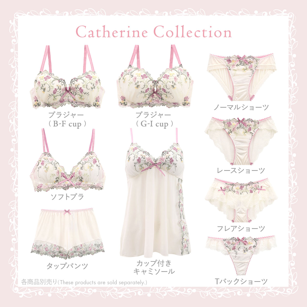 散りばめられた多色の花々が華やかでフェミニンな印象の「カトリーヌ」コレクション。様々なお花の絡み合うような動きは、豪華な花冠をイメージしています。