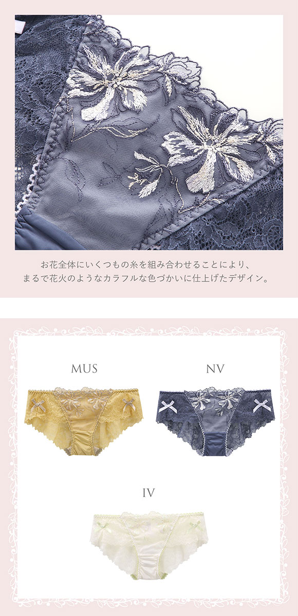 | 仕 様 | ・伸縮性:バック縦横にあり ・クロッチ:付き ・透感:バックレース部にあり ※生地の使用部分により、柄の出方が異なる場合がございます。予めご了承ください。 |