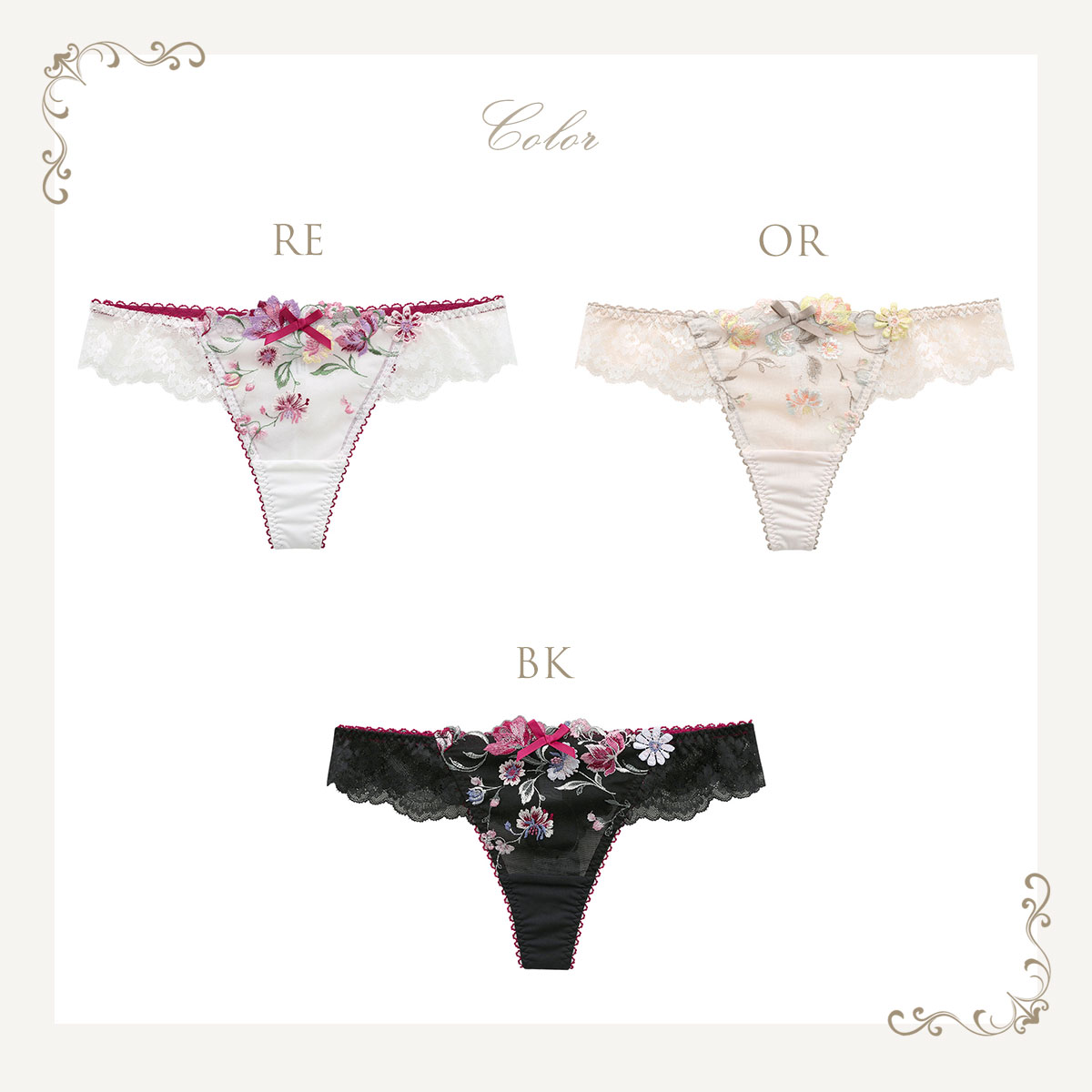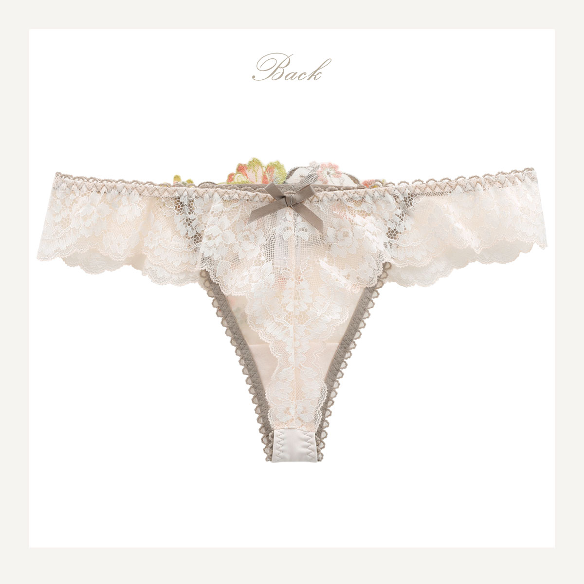 サイド&バックはレースデザインでセクシーな印象のTバックショーツ。フロント&バックにはサテンリボンを付けています。ショーツのラインが気にならないためボトムスの種類を問わず幅広くご着用いただけます。