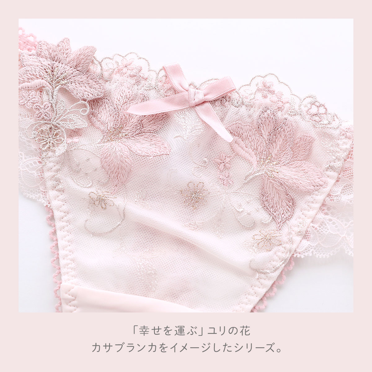 「幸せを運ぶ」ユリの花、カサブランカをイメージしたシリーズ、「フルーリ」コレクション。花びらをあたたかみのあるウーリー糸と普通糸、ラメ糸をミックスして刺しゅうすることで、柄行の変化や奥行きを表現。