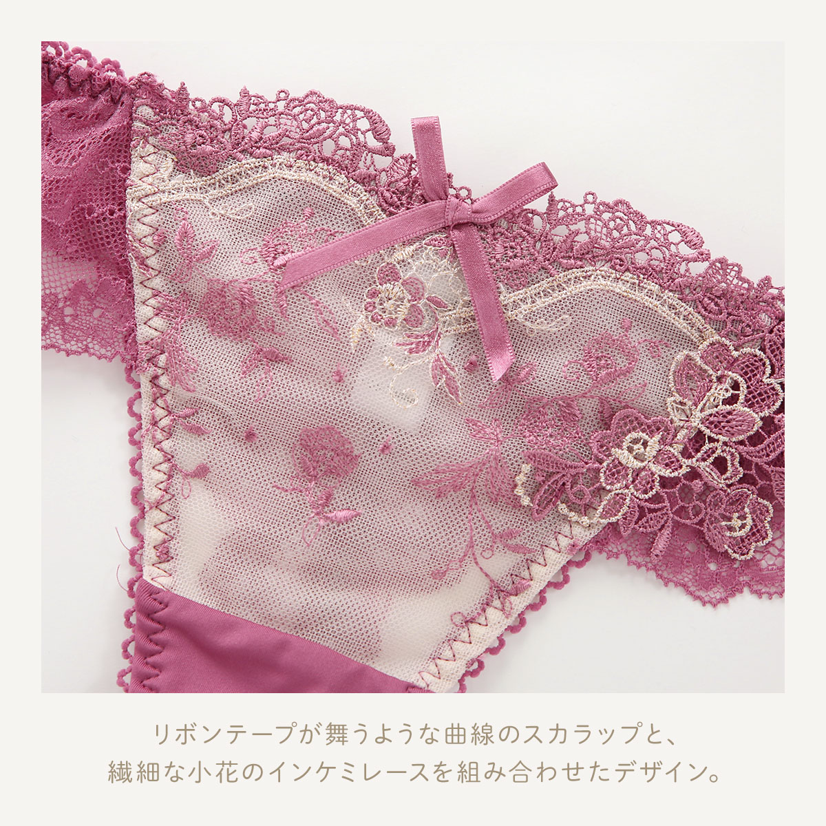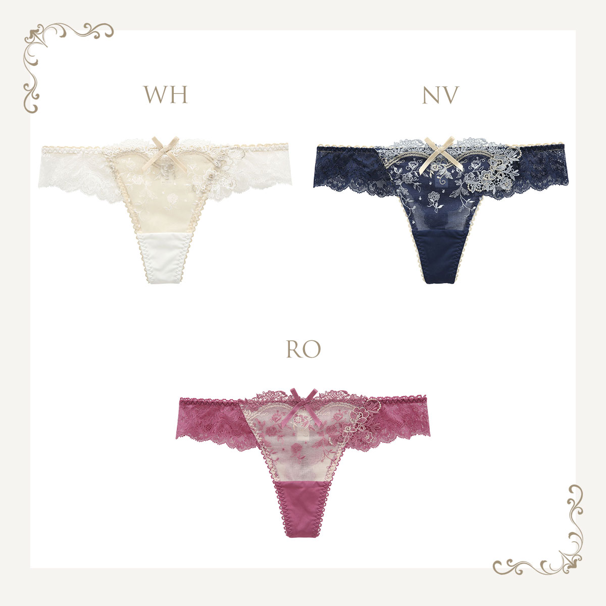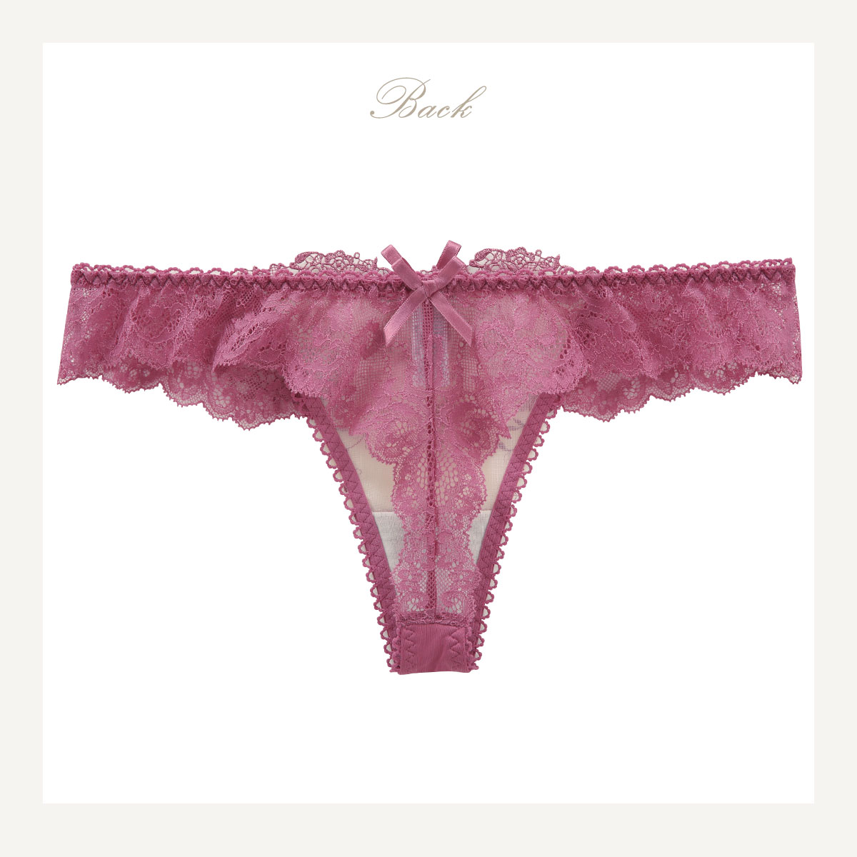ウエストからバック部分にかけてレースを豪華にあしらったTバックショーツ。キュートなスカラップのレースがポイントです。ショーツのラインが気にならないためボトムスの種類を問わず幅広く着用いただけます。