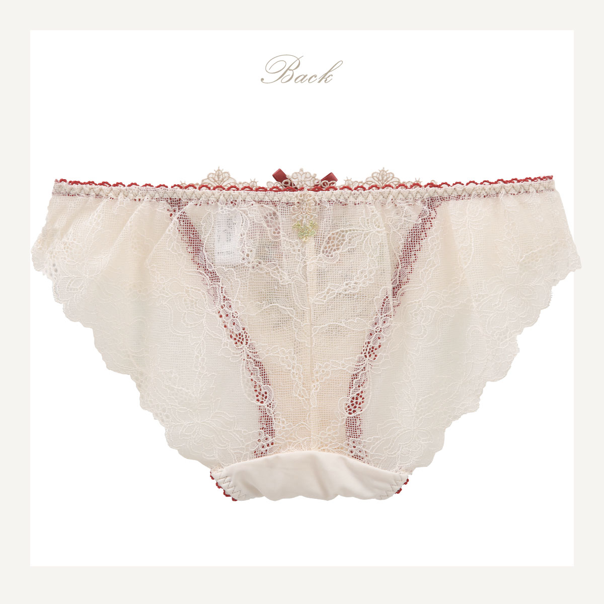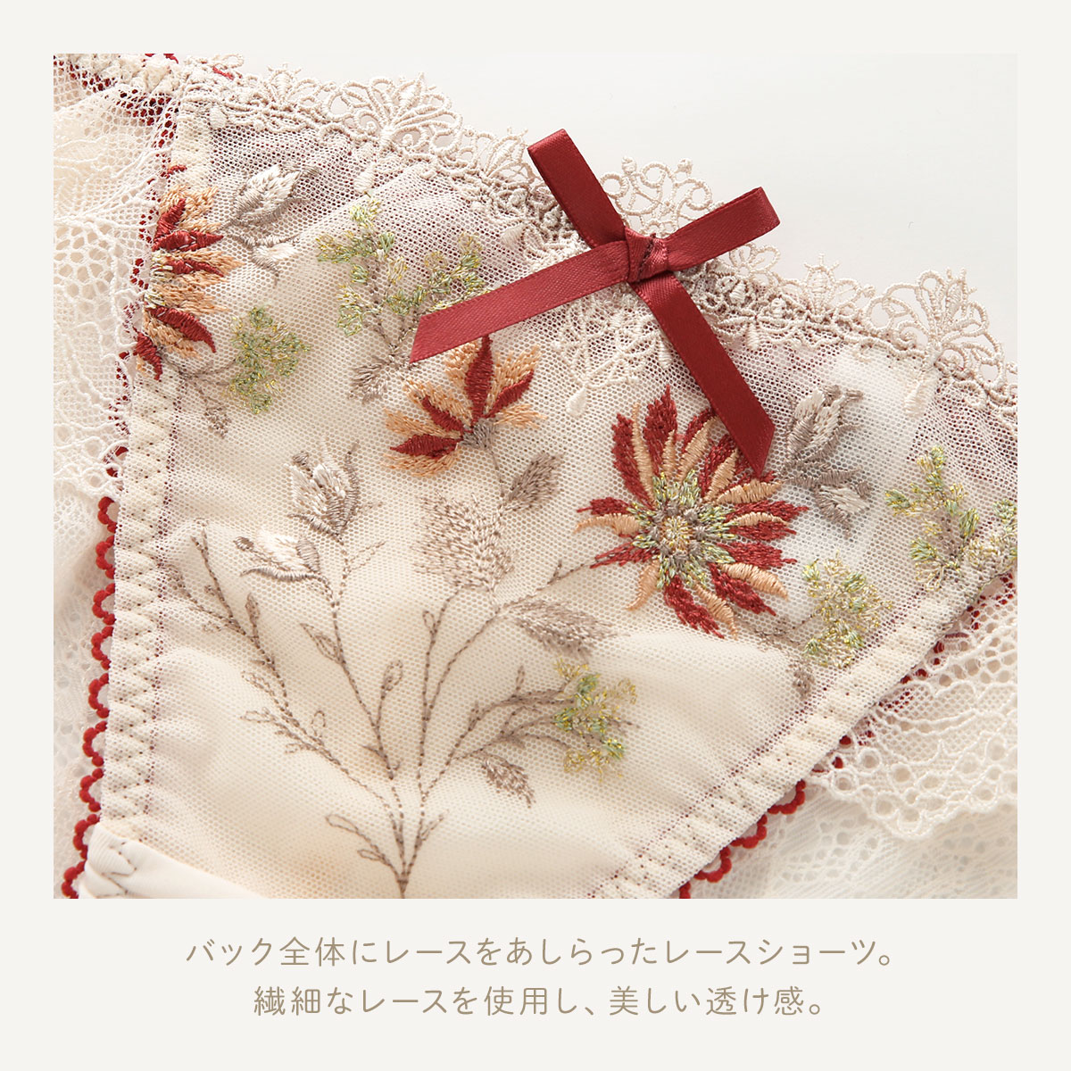 バック全体にレースをあしらったレースショーツ。繊細なレースを使用し、美しい透け感。伸縮性があるのでほどよくヒップにフィットします。
