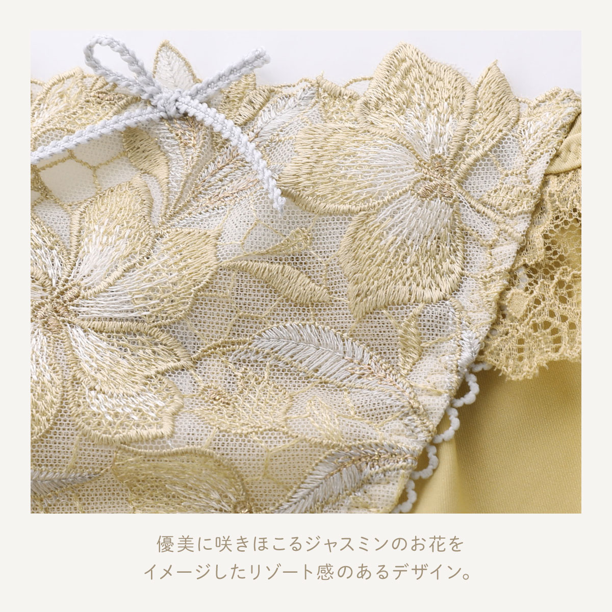 優美に咲きほこるジャスミンのお花をイメージしたリゾート感のあるデザインの、リサマリレーヌ「ケリー」コレクション。全体をケミカル調のレースで仕上げ、爽やかで華麗な印象に。