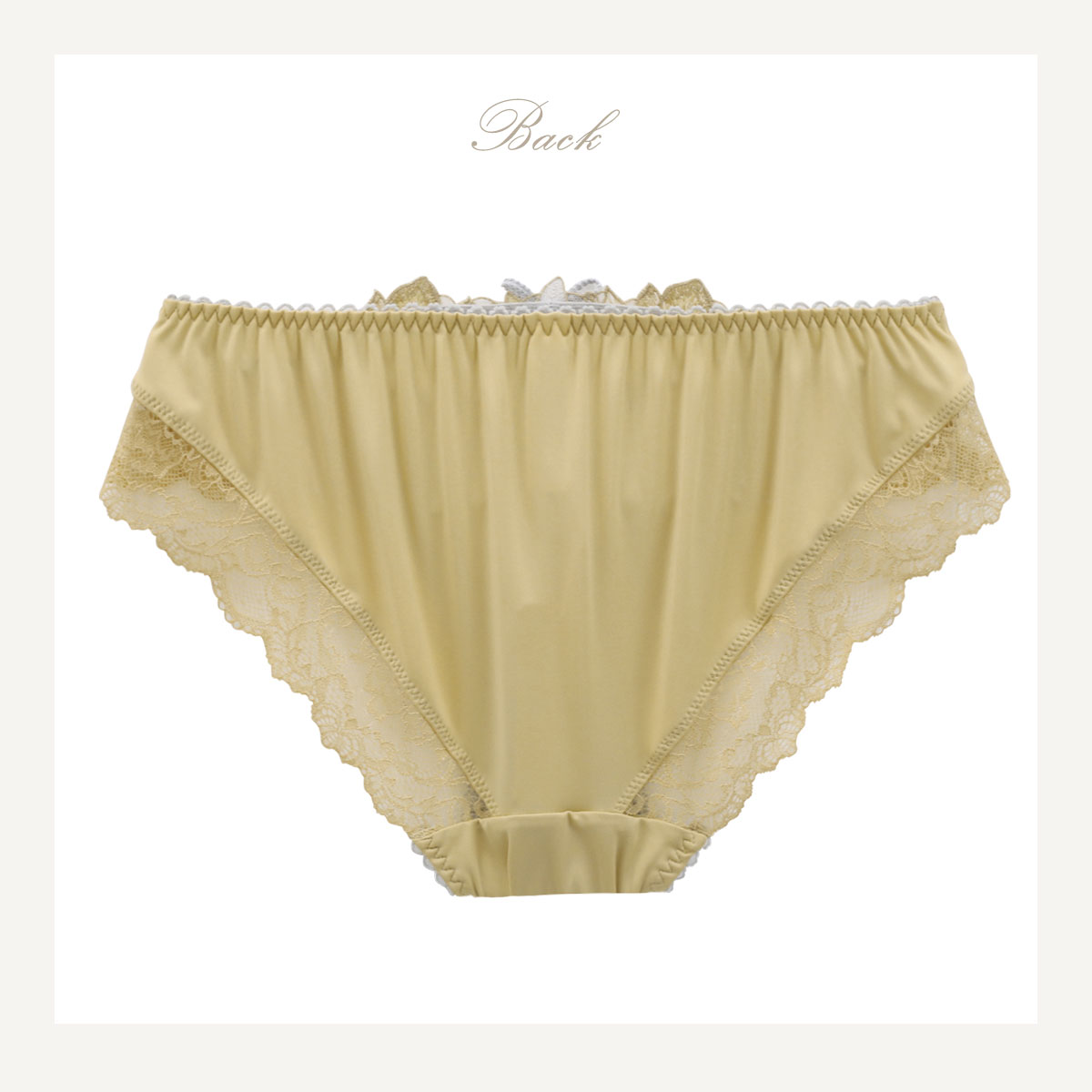 バックの身生地は、伸縮性があり気持ちいいなめらかな素材です。縦横にストレッチ性があり、ヒップにフィットします。バック足口はレース付きで後ろ姿も華やかに。