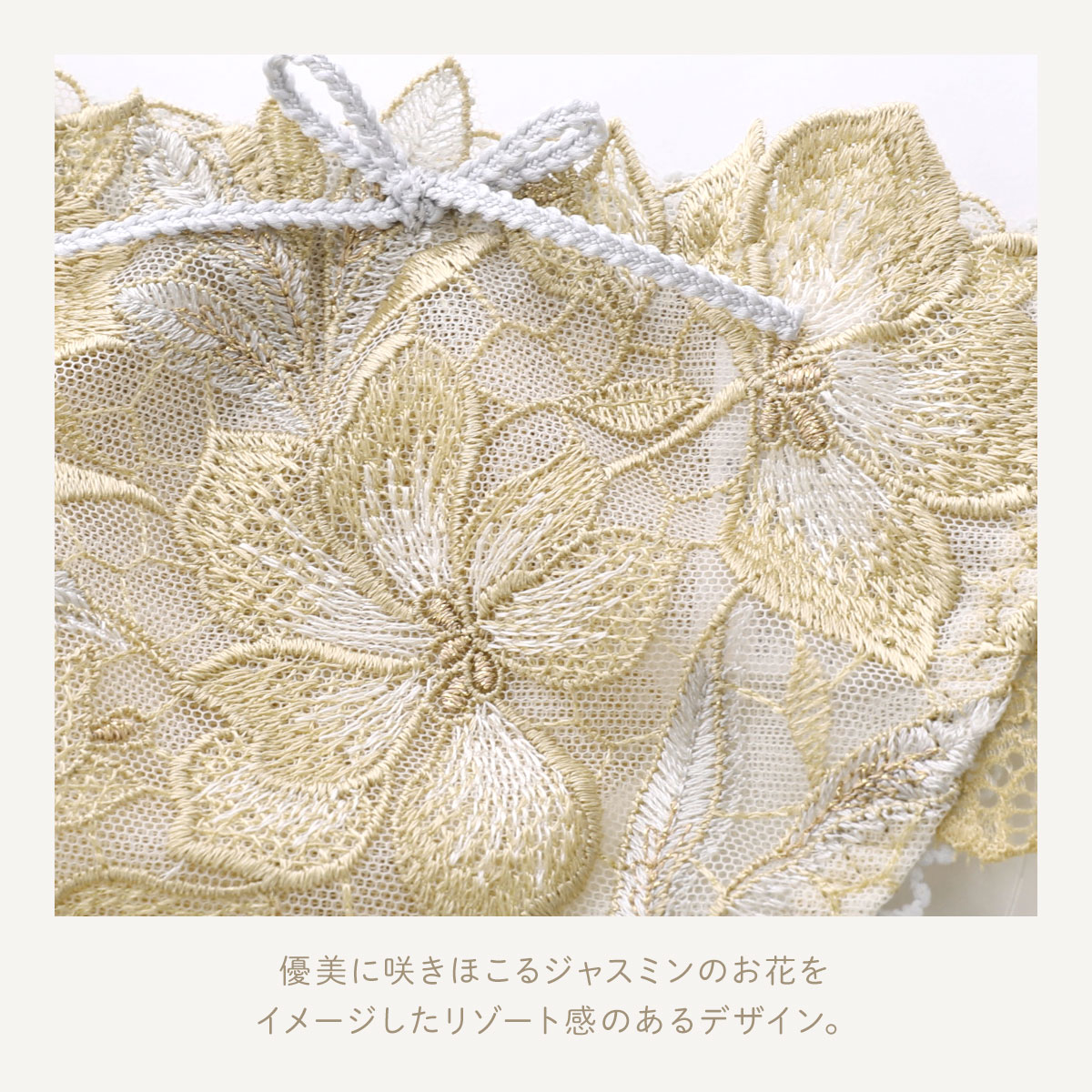 優美に咲きほこるジャスミンのお花をイメージしたリゾート感のあるデザインの、リサマリレーヌ「ケリー」コレクション。全体をケミカル調のレースで仕上げ、爽やかで華麗な印象に。