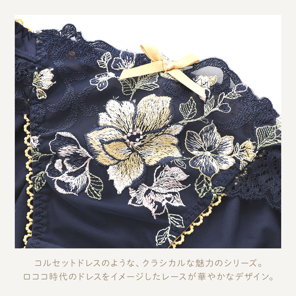 コルセットドレスのようなクラシカルなデザインが魅力のシリーズ、リサマリレーヌ「エリオット」コレクション。ロココ時代のドレスをイメージしたレースは、お花と幾何学模様をあしらい、それぞれステッチを変化させることで華やかさと奥行きを演出。全体的に丸みのあるシルエットで、まるでコルセットドレスをまとったかのような、豪華で気品あふれる美しさに仕上げました。